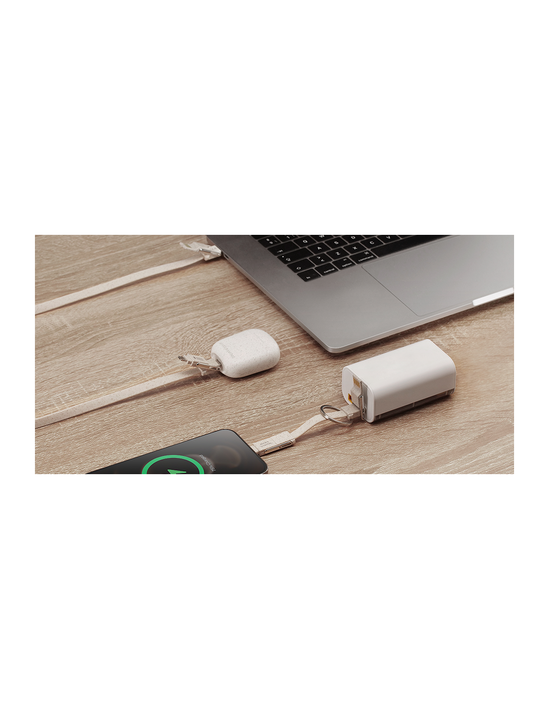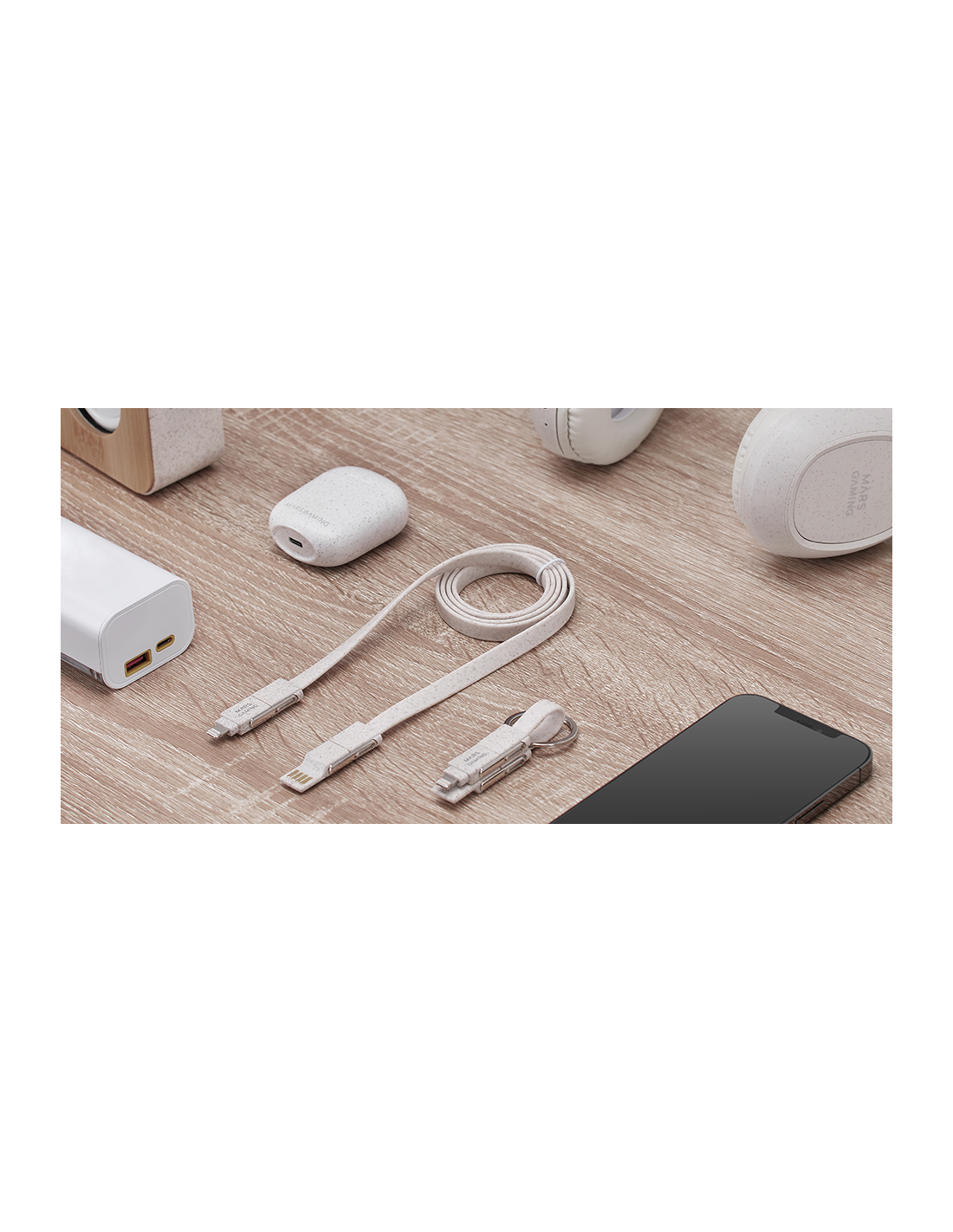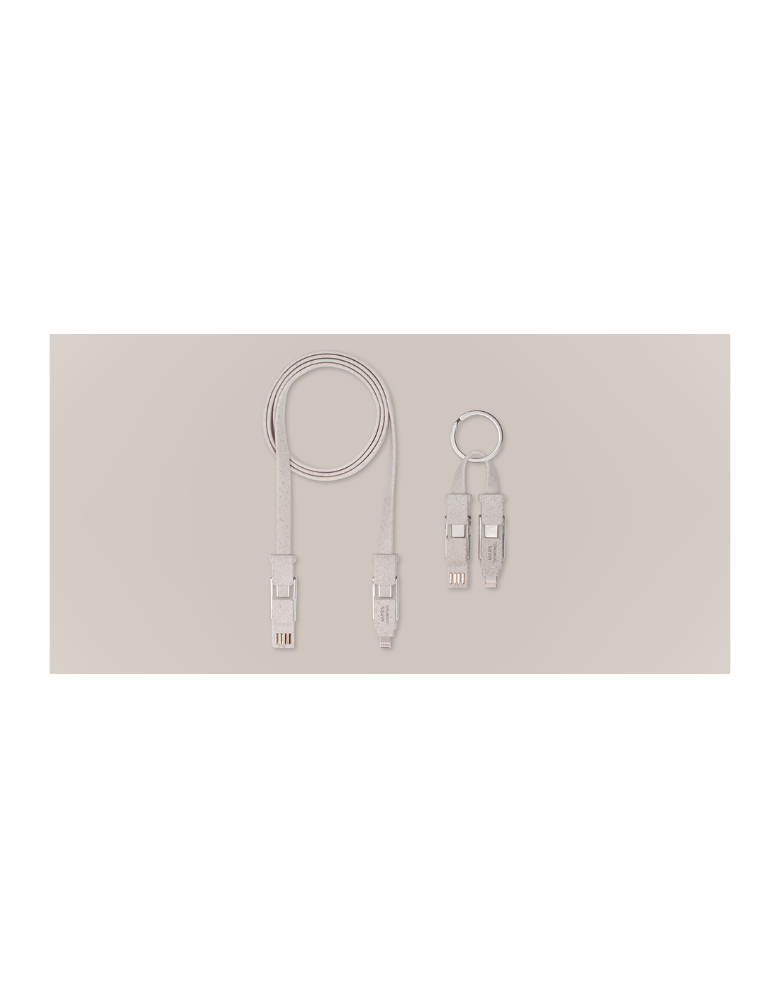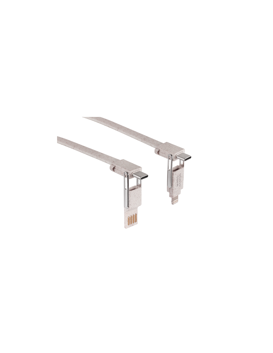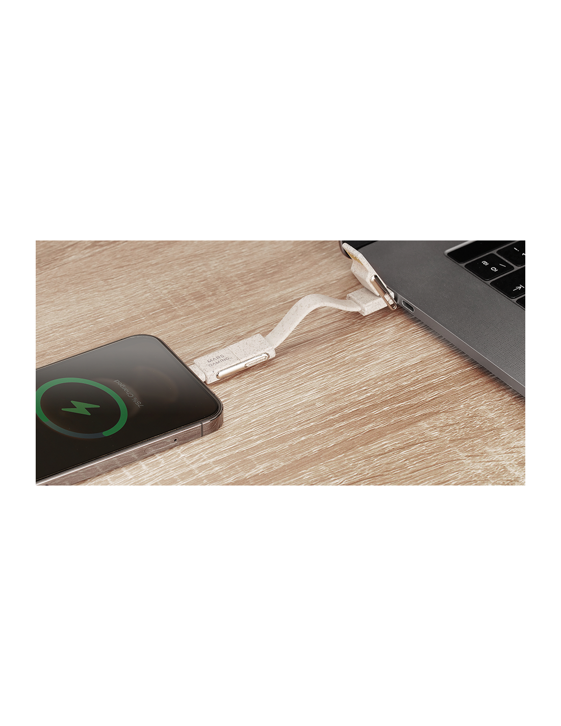 اثنين من الكابلات البيولوجية المستدامة مصنوعة من بديل مبتكر للبلاستيك: ألياف القمح. كابل المفاتيح بتصميم قابل للطي مغناطيسي سهل الحمل وكابل XL بطول 1 متر. كابل فائض متعدد الوصلات USB، شحن سريع جدا 3.1، 50 W ونقل البيانات.