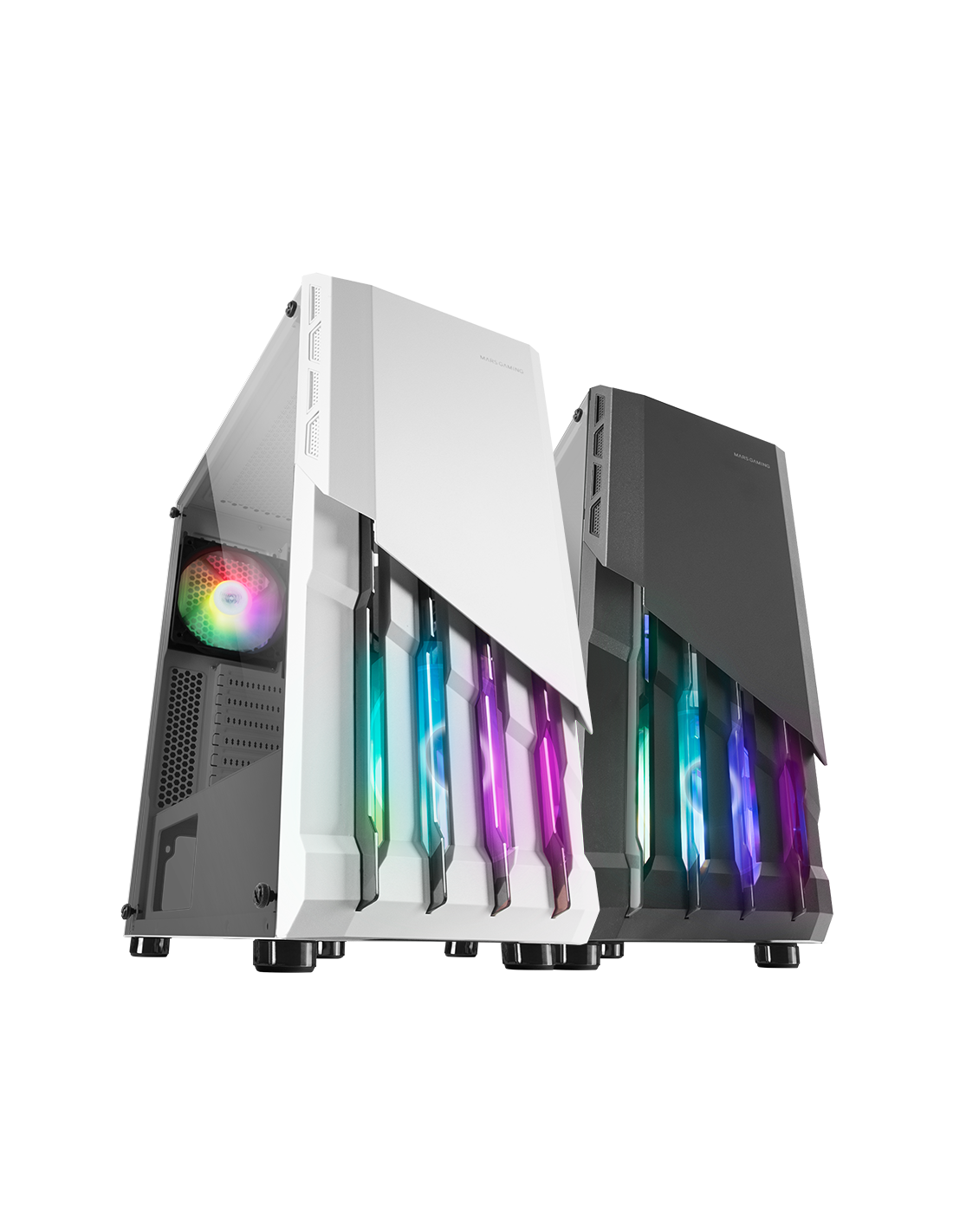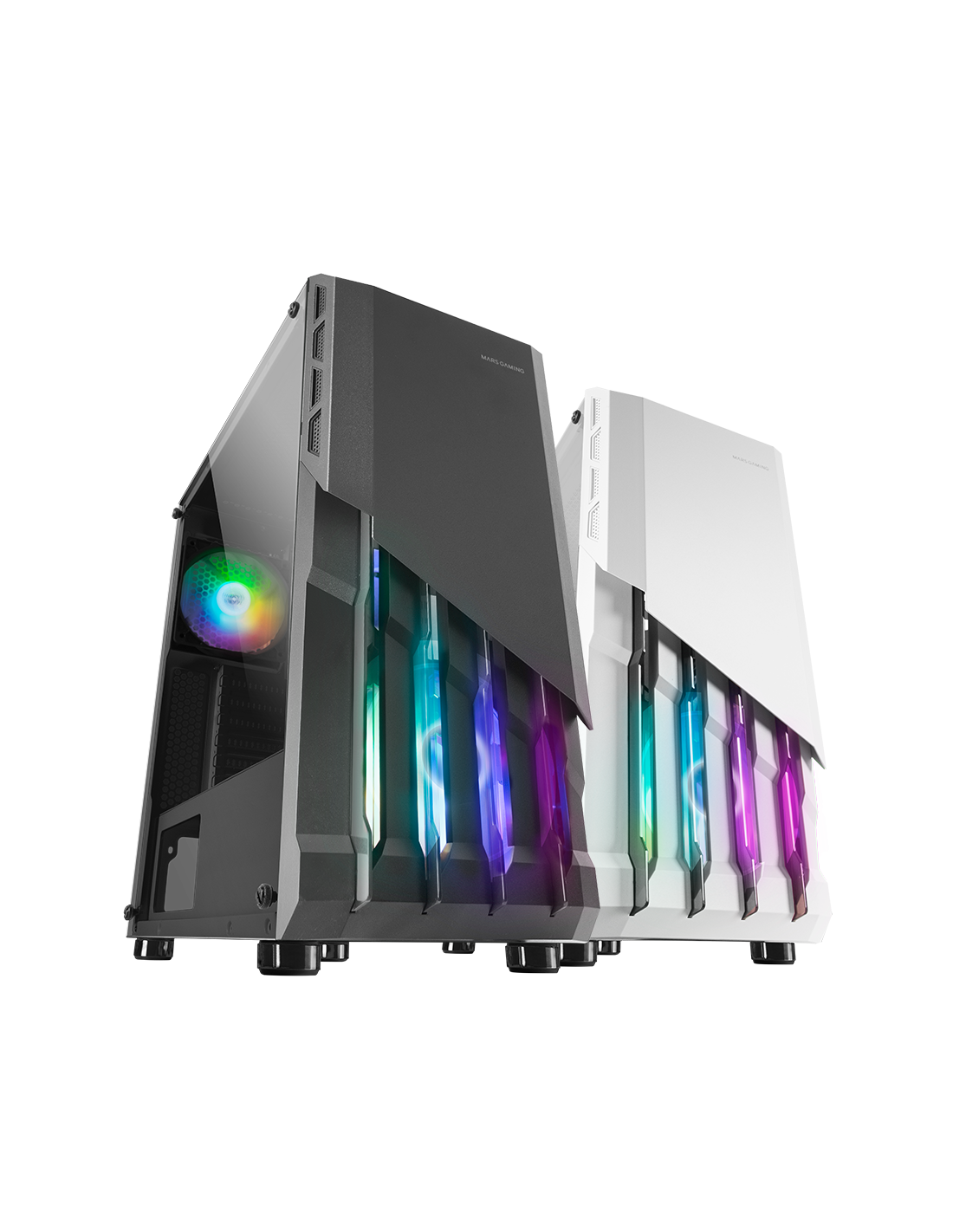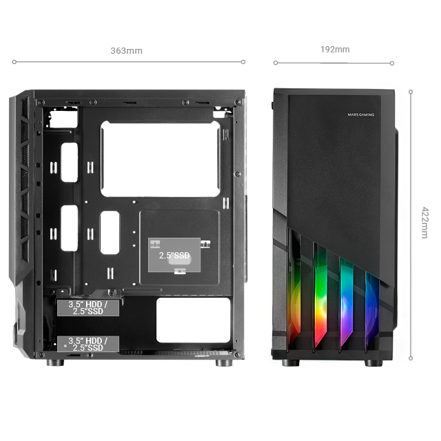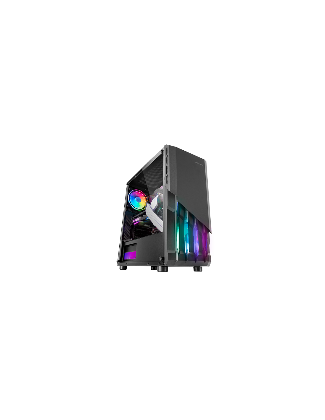 جبهة مهيبة مصنوعة من الفولاذ ومروحتين FRGB مرفقتين لتبريد ممتاز كمعيار. مساحة للسوائل تصل إلى 240 مم وبطاقات رسومات كبيرة جداً بثلاثة مراوح.