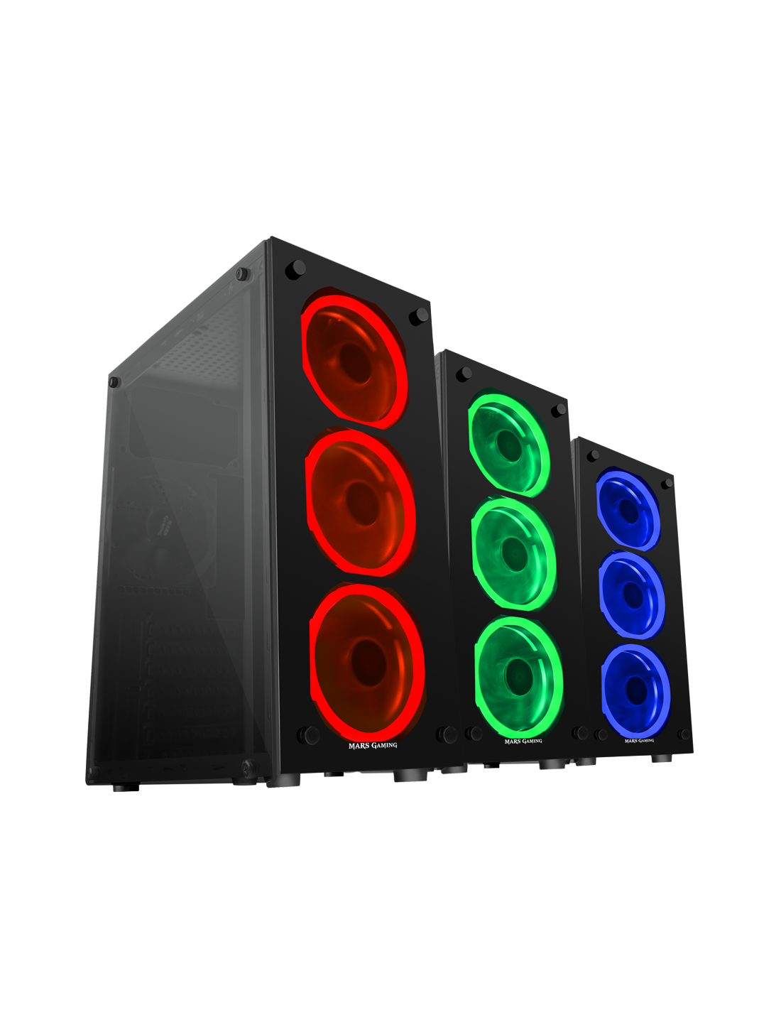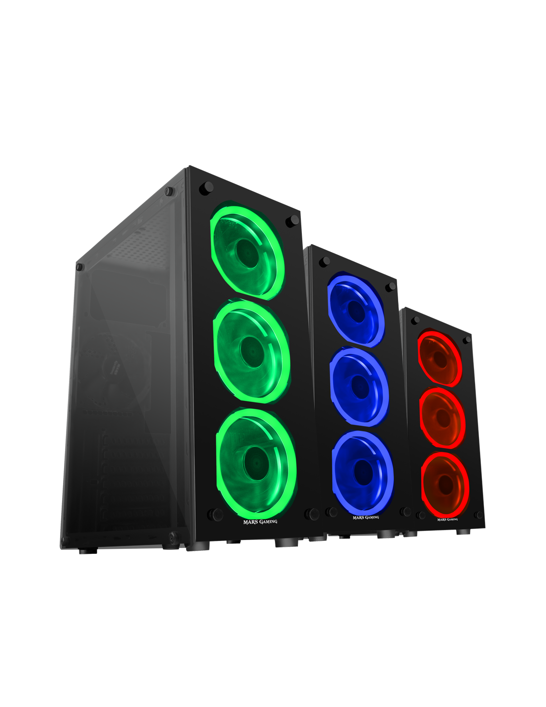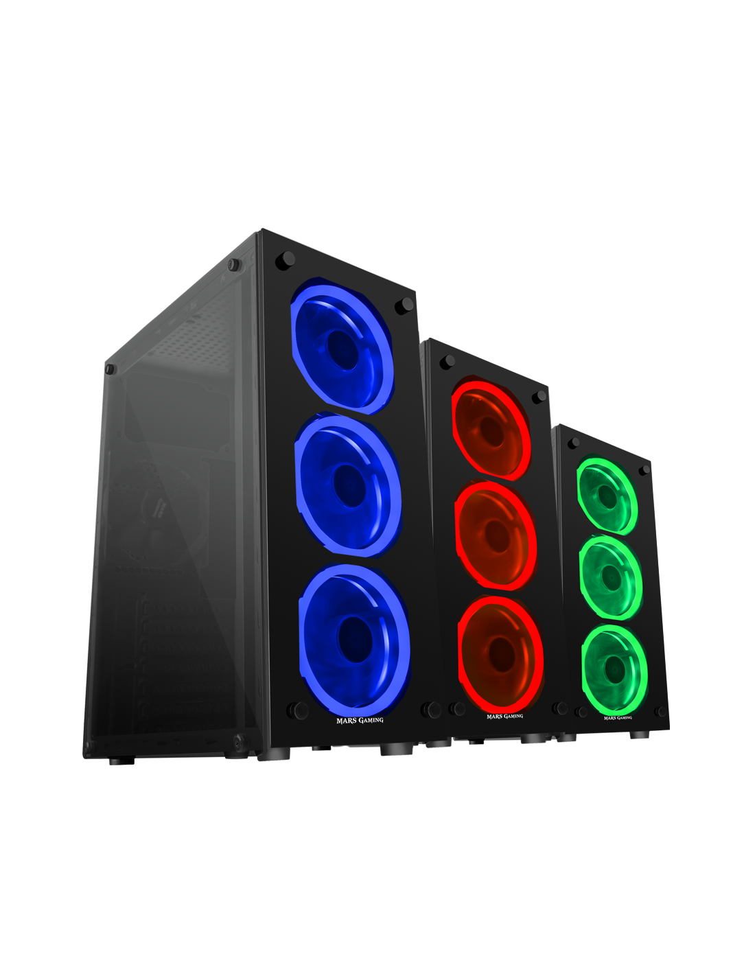 تهوية ثلاثية، إضاءة ثلاثية: مع MCG، ستستمتع ببرج ألعاب نصفي مزود بثلاثة مراوح أمامية مع إضاءة LED في ثلاثة إصدارات مختلفة: BLUE، RED و GREEN. بتصميم يتضمن نافذة جانبية وأمامية من الزجاج المقسى، هيكل ATX / MicroATX ومساحة داخلية محسّنة، ستتيح لك MCG تصميم جهاز الكمبيوتر الخاص بك للألعاب مع الإضاءة التي تعجبك أكثر.