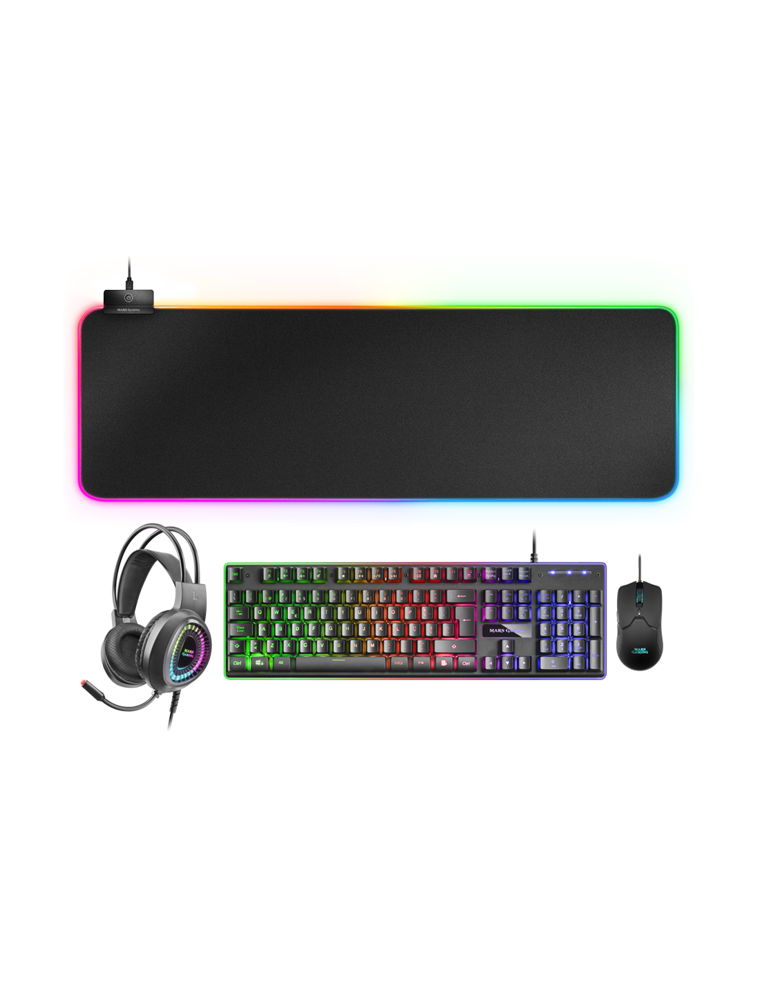 الحزمة الألعاب النهائية. 4 أجهزة ملحقة RGB بأفضل المواصفات: لوحة مفاتيح هجينة H-MECH، فأرة خفيفة جداً 10K مع برنامج التحكم، سماعات الرأس RGB FLOW المعلقة مع الصوت المكاني وسجادة RGB المدهشة. التوافق العالمي متعدد الأنظمة الأساسية للكمبيوتر الشخصي والأجهزة اللعب.