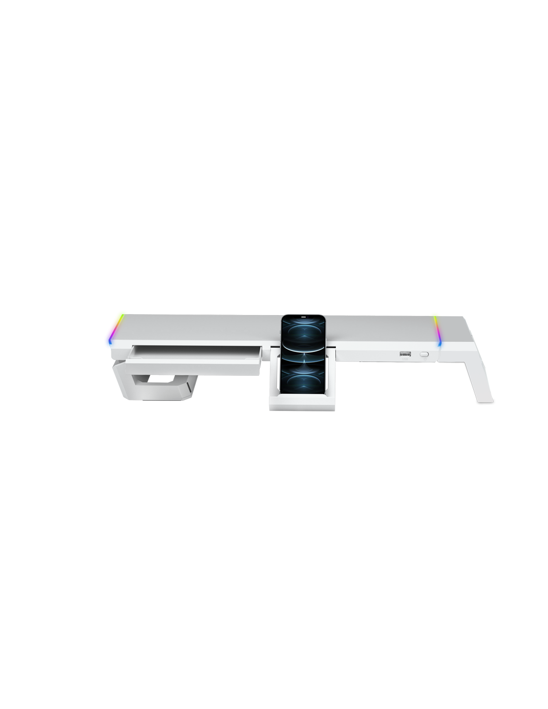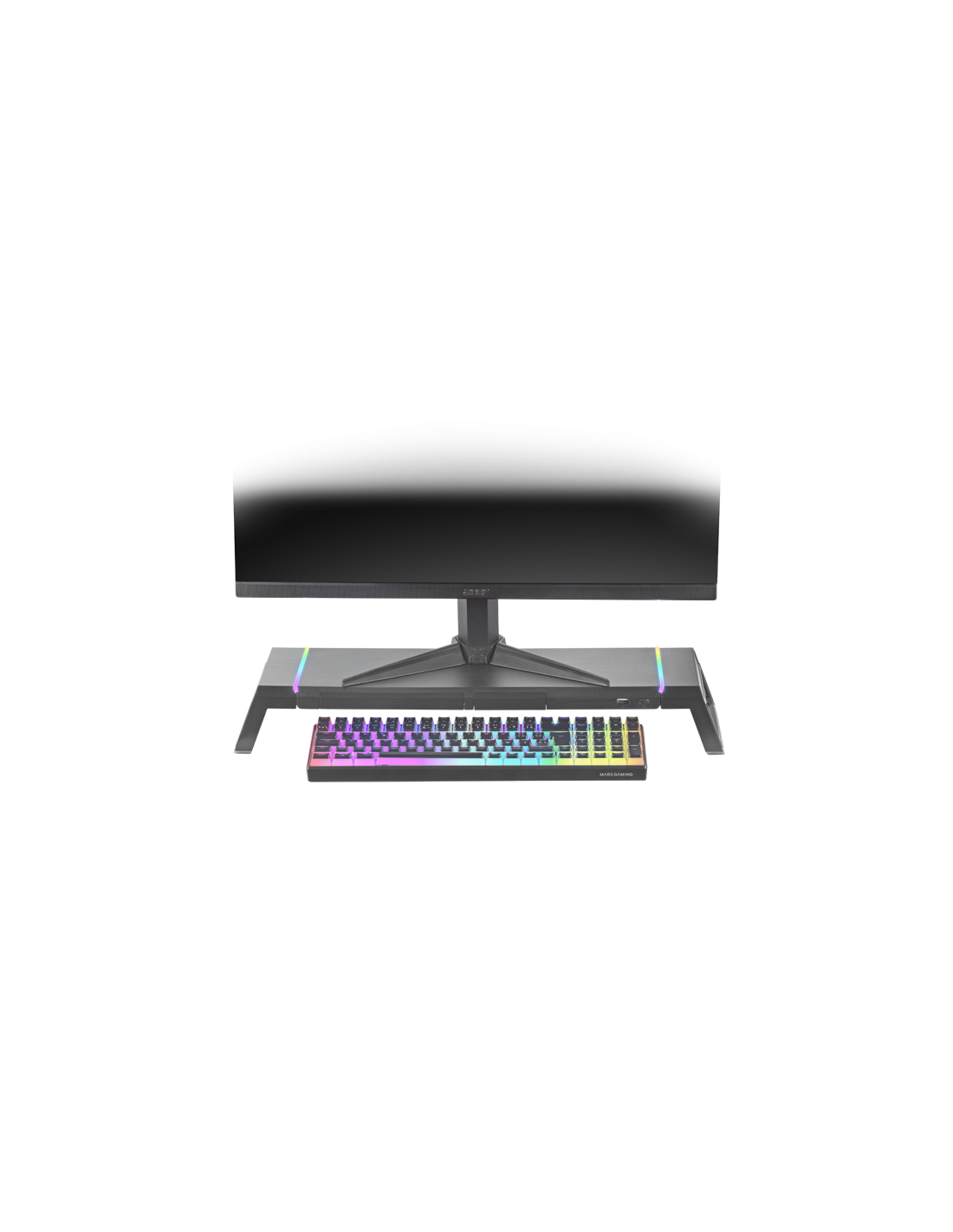 دعم متميز للشاشة مع إضاءة متقدمة من CHROMA RGB، ومنفذ USB 2.0، ودعم للهواتف المحمولة/الأجهزة اللوحية ودرج للتخزين. قابل للتعديل بالكامل مع 3 أحجام مختلفة بفضل جوانبه القابلة للطي.