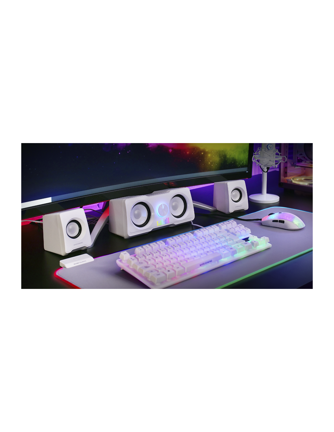 القوة وجودة الصوت مع النظام الأكثر ابتكارًا 2.2. 35 واط من القوة مع DSP الرقمي ، مضخم صوت مزدوج ، التحكم المباشر في مستوى الصوت وإضاءة RGB flow. صُمم خصيصًا لتحقيق أداء قوي للجهير والنغمات المتوسطة بشكل مطلق ، يحدث نظام الصوت MS22 ثورة في إعدادك مع مظهر مدهش وأفضل تكنولوجيا للصوت.