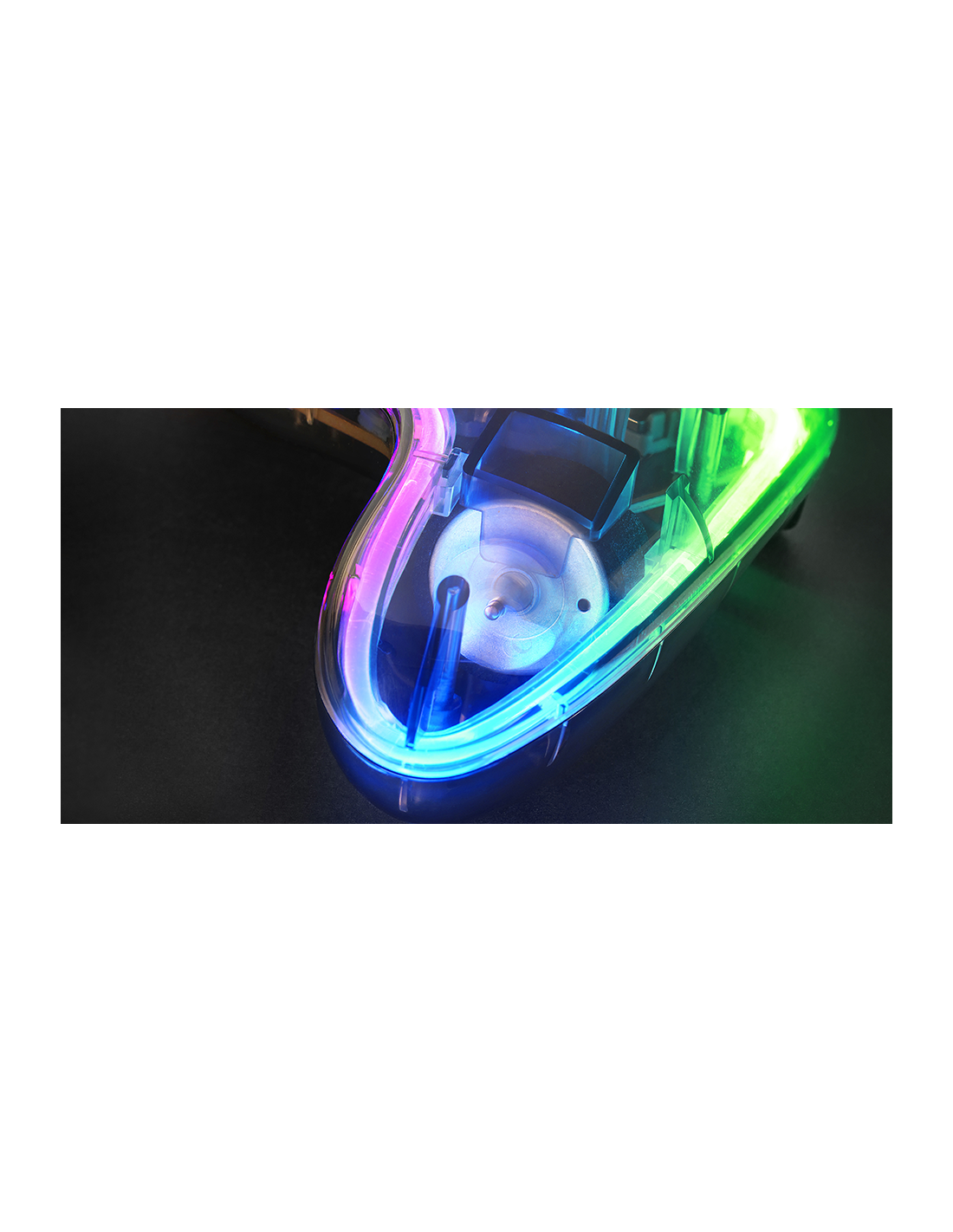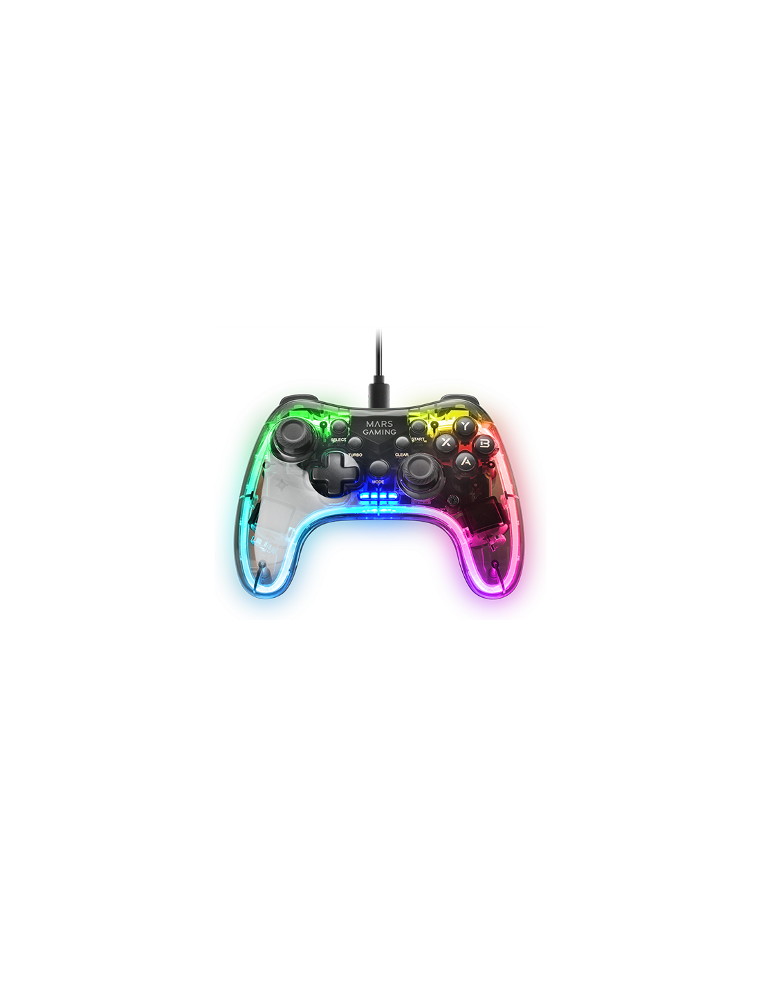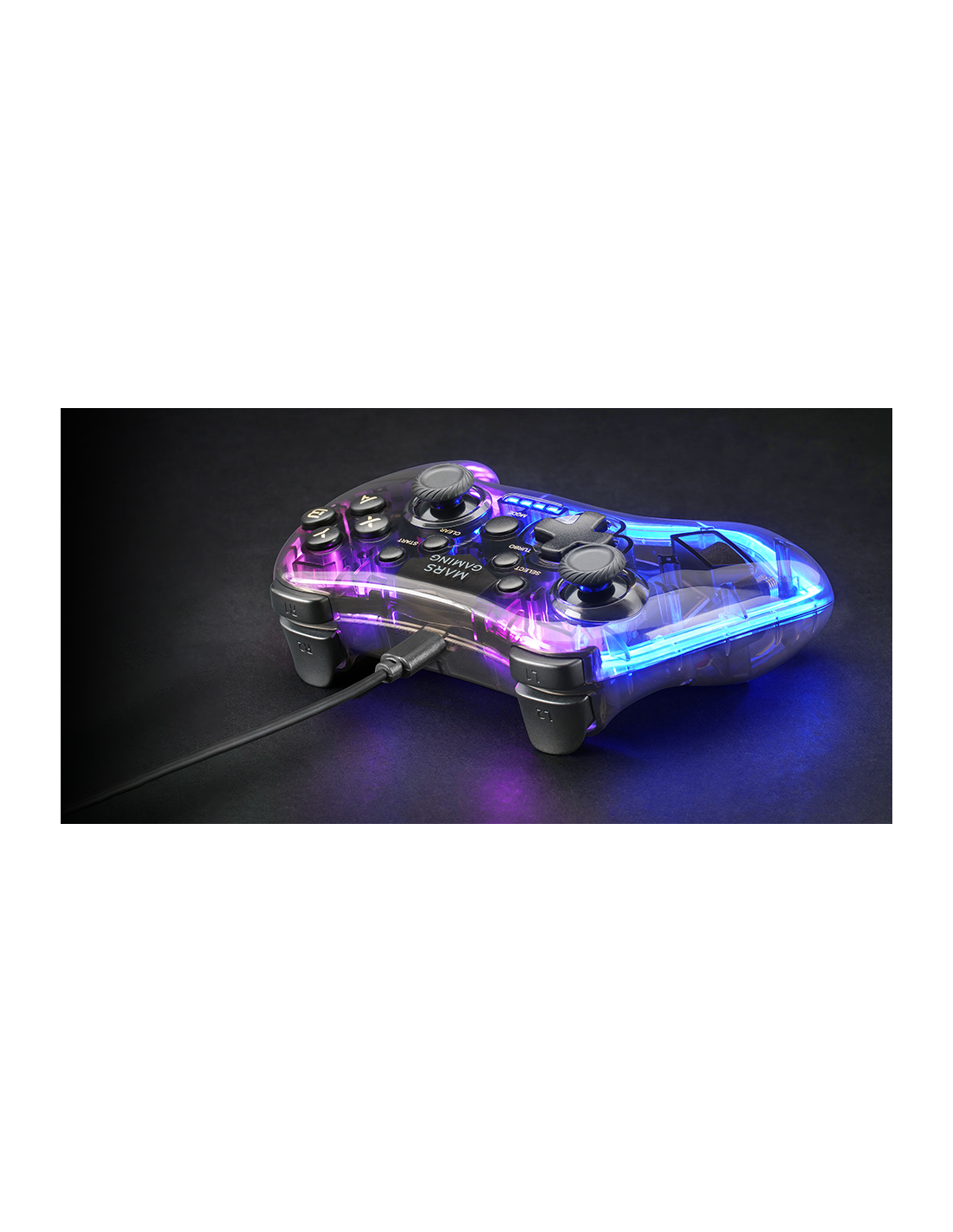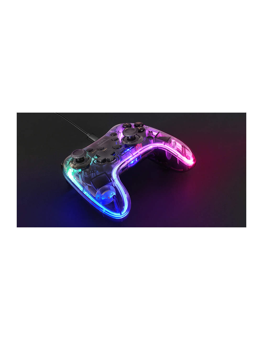 Professioneller Gamepad mit einem spektakulären schwarzen transluzenten Design und Neon-RGB-Beleuchtung. Duales haptisches Vibrationssystem, USB-A / USB-C Wechselkabel und Multiplattform der oberen Kompatibilität.