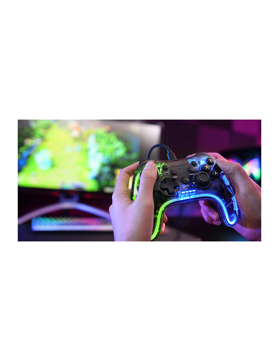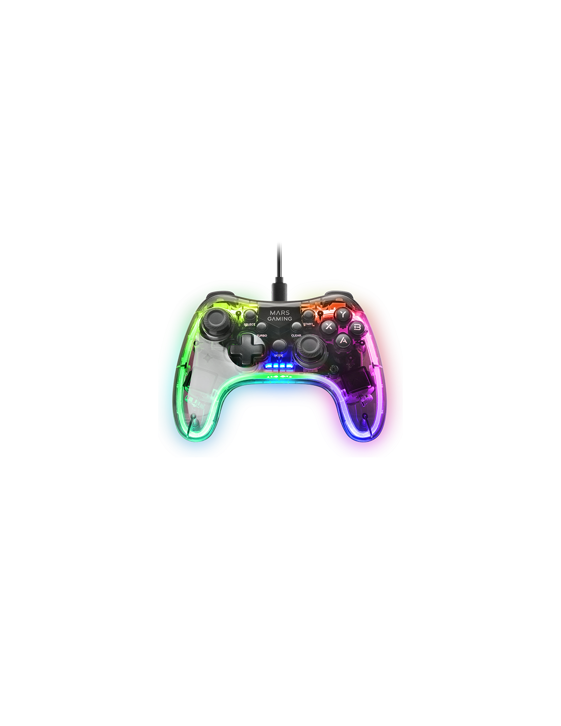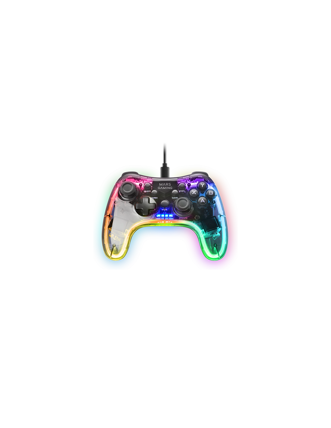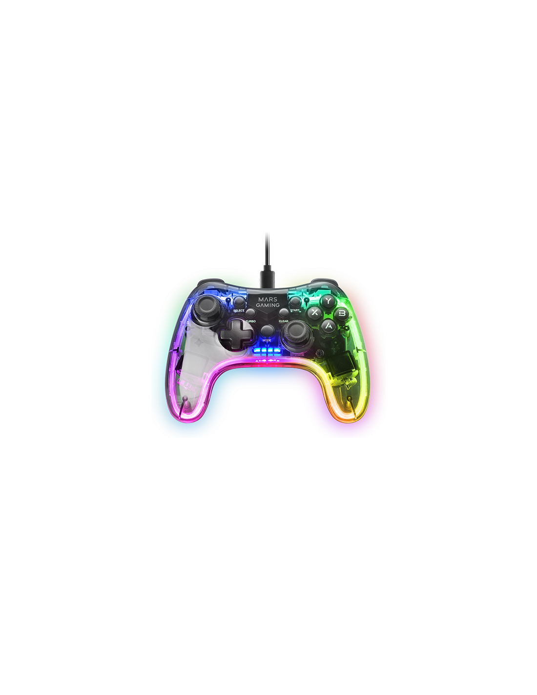 Professioneller Gamepad mit einem spektakulären schwarzen transluzenten Design und Neon-RGB-Beleuchtung. Duales haptisches Vibrationssystem, USB-A / USB-C Wechselkabel und Multiplattform der oberen Kompatibilität.