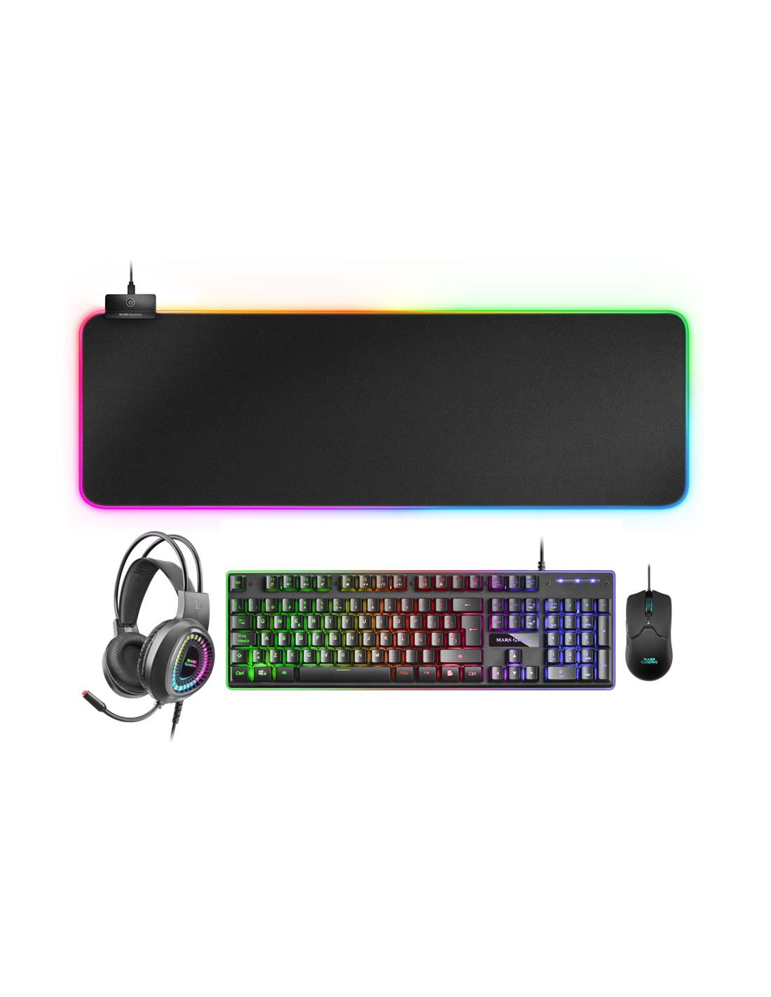 Das letzte Spiel Packung. 4 RGB-Peripheriegeräte mit den besten Funktionen: H-Mech-Hybrid-Tastatur, 10k-Ultra-Licht-Maus mit Steuerungssoftware, RGB-Strömungskopfhörer mit Leerzeichen und eine spektakuläre RGB-Matte. Universalkompatibilität Multiplatform PC und Konsolen.