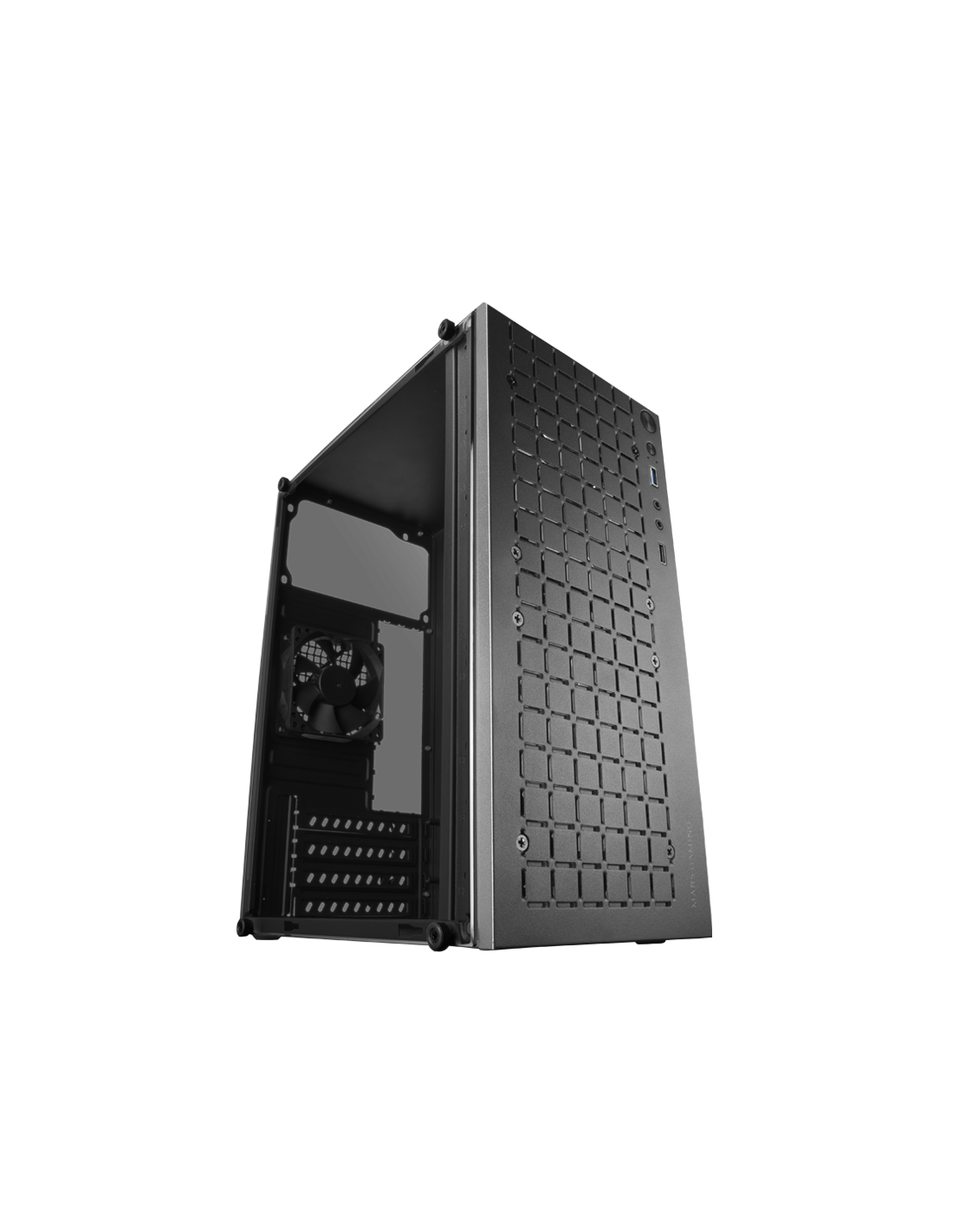 Professional design with metal-mesh grid that improves aesthetics and total side window. High performance configurations in * microatx and mini-itx format and ultrasilencious FDB rear fan included.