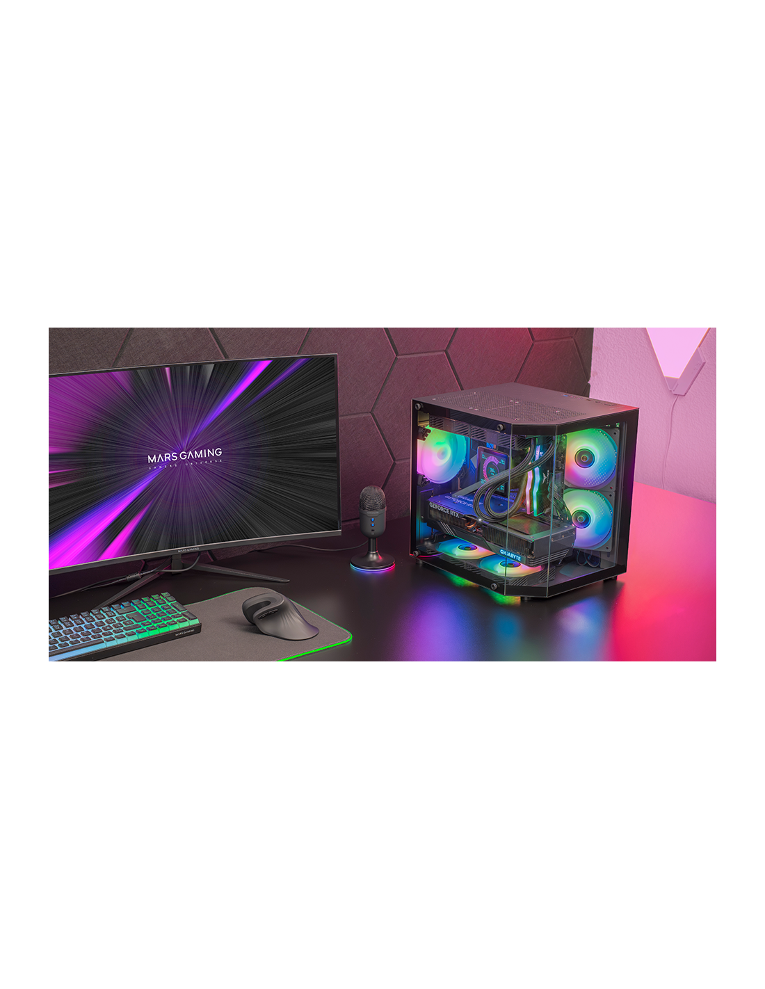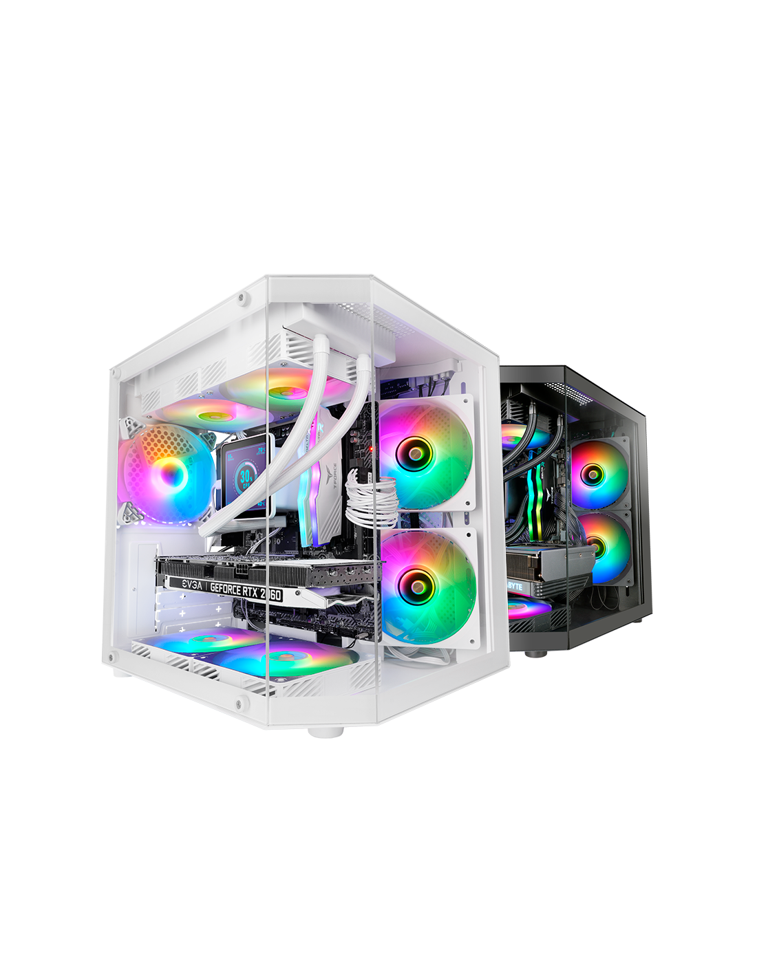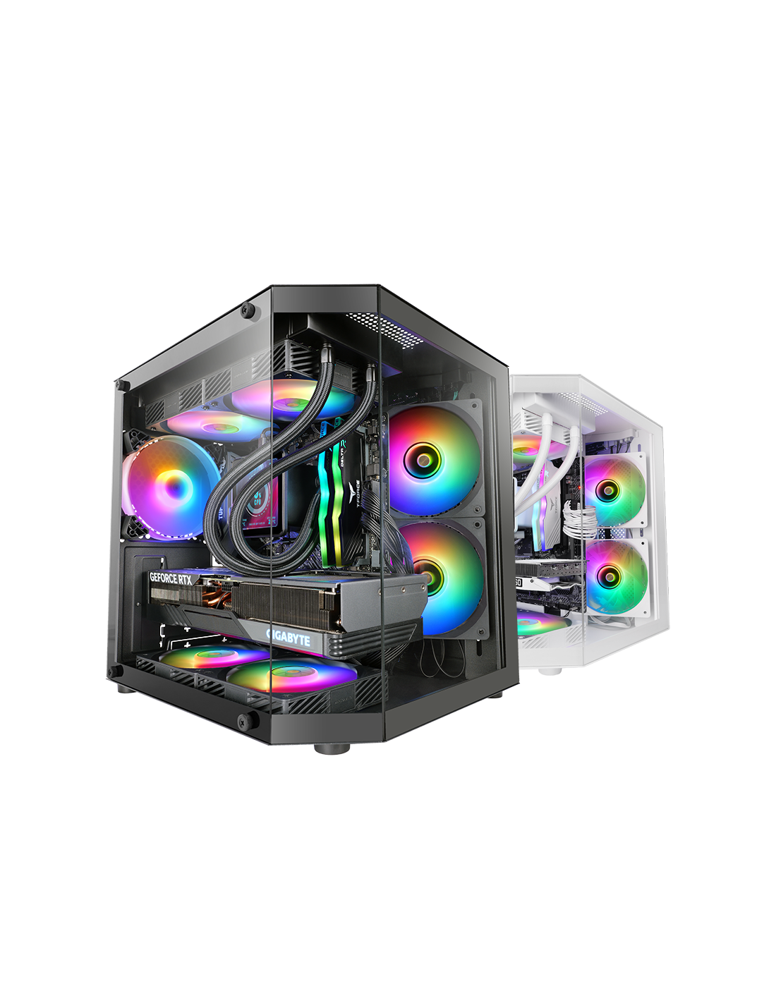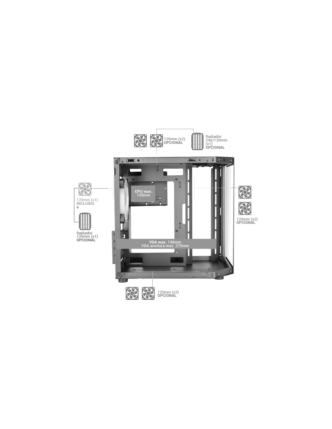 Its compact MicroArtx panoramic design with triple continuous tempered glass, double camera structure and large internal capacity allows you to show your hardware with an outstanding thermal performance. With rear fan FRGB included, support for up to 7 fluid fans and coolings up to 240 mm, it is ready for any challenge in the least space