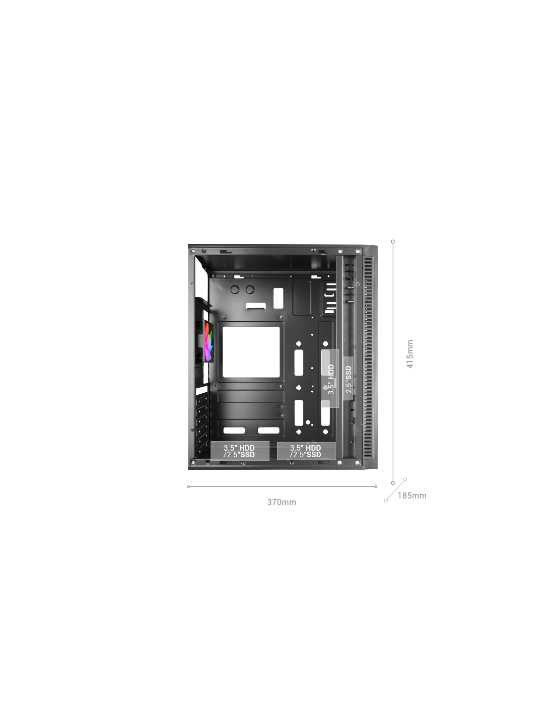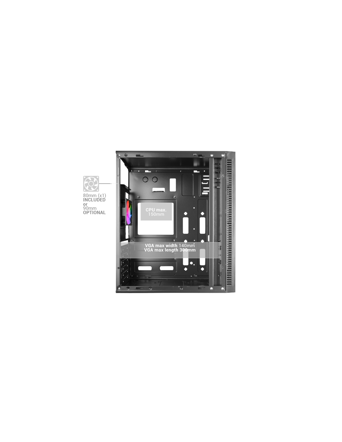 MC-Blaze combines modern design, lighting and thermal efficiency, offering a perfect balance between style and functionality. Its front with LED strip and full side window allow you to display each component with a clean and sophisticated finish. Equipped with a FRGB rear fan and lateral ventilation grille, it guarantees an optimized air flow. Compatible with ATX base plates, Micro-ATX and Mini-ITX, supports GPU of up to 300mm and has 7 expansion slots, ensuring maximum versatility in any configuration.