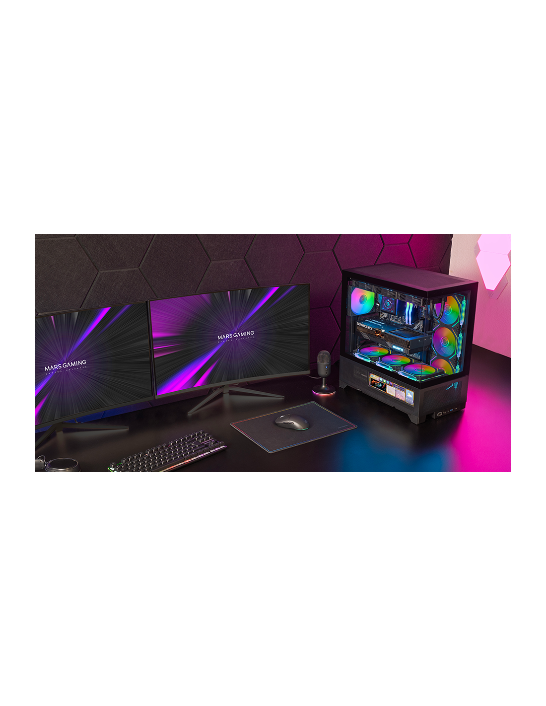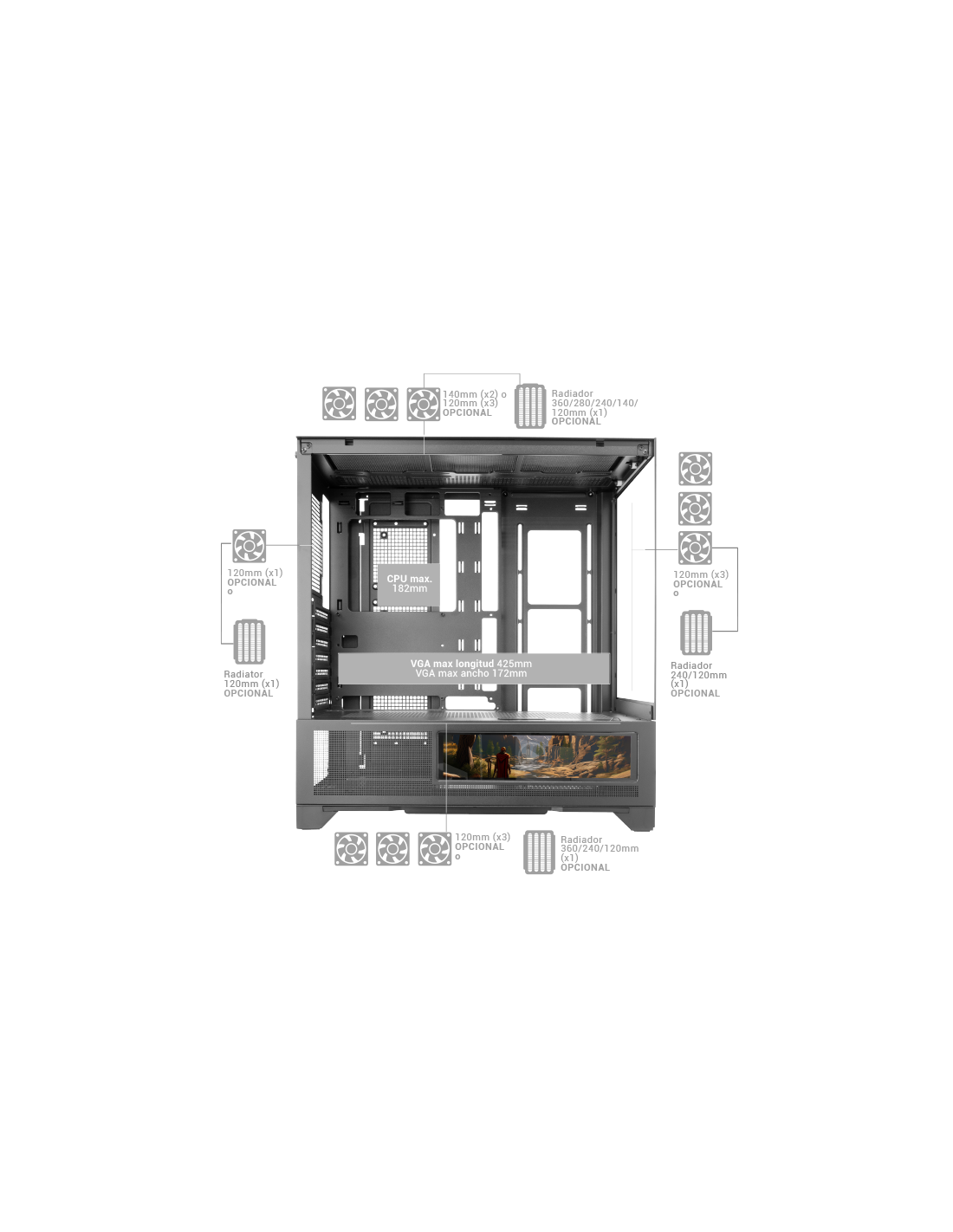 Discover the MC-LCDX, an ATX case that redefines your setup with a unique combination of advanced functionality and integrated technology. Equipped with an impressive 9.16" IPS display with HDMI connection, continuous front and side tempered glass panels, and full support for up to 360mm liquid cooling and a FULL MESH bottom panel, this tower is designed to visually stand out and perform at the highest level.
