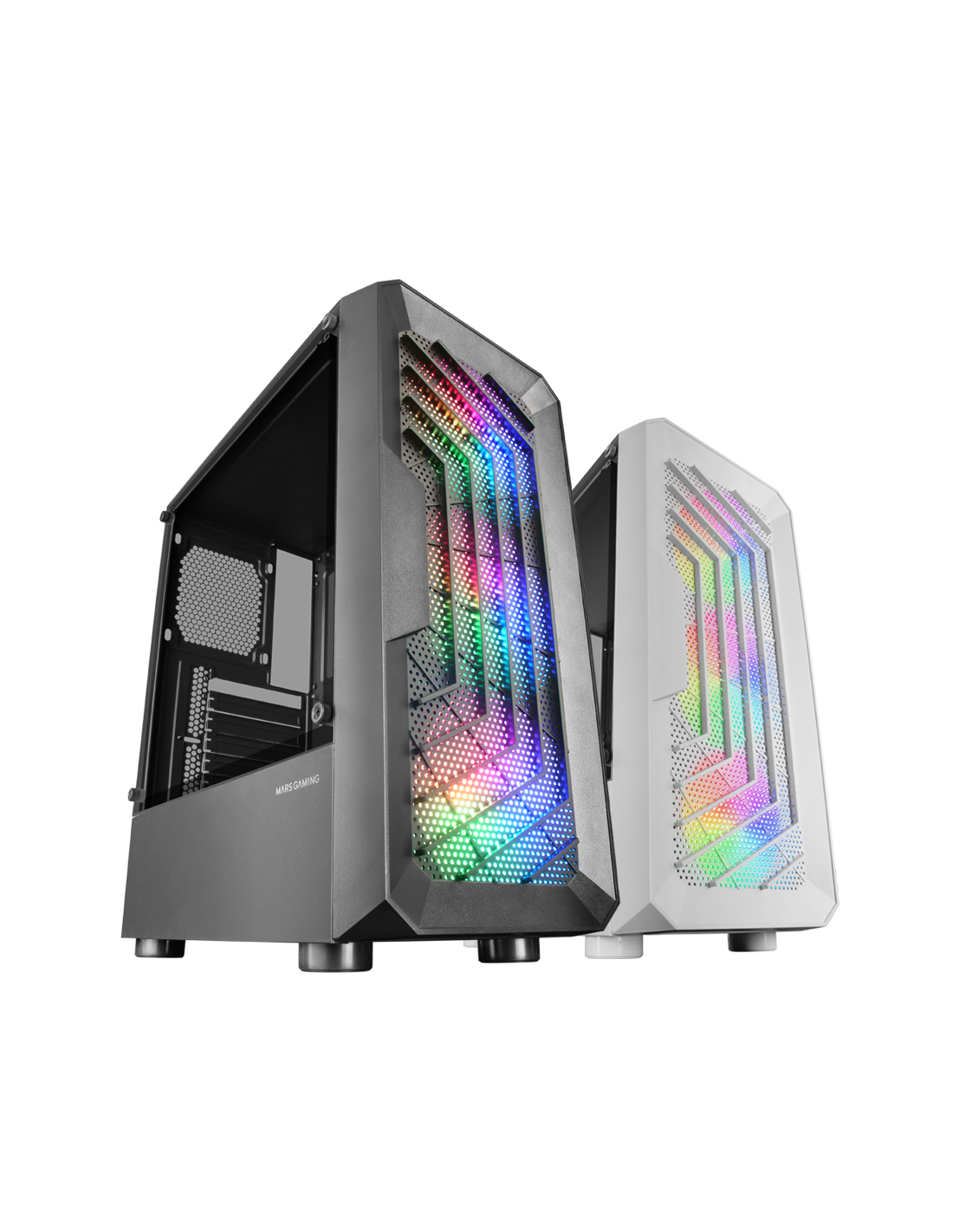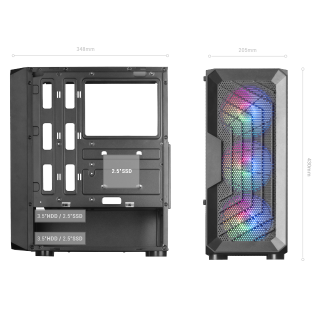 Frontal mesh and dual camera design. 3 120mm FRGB fans. Wide storage for hard drives. Liquid space of up to 240mm and 306mm graphics cards.