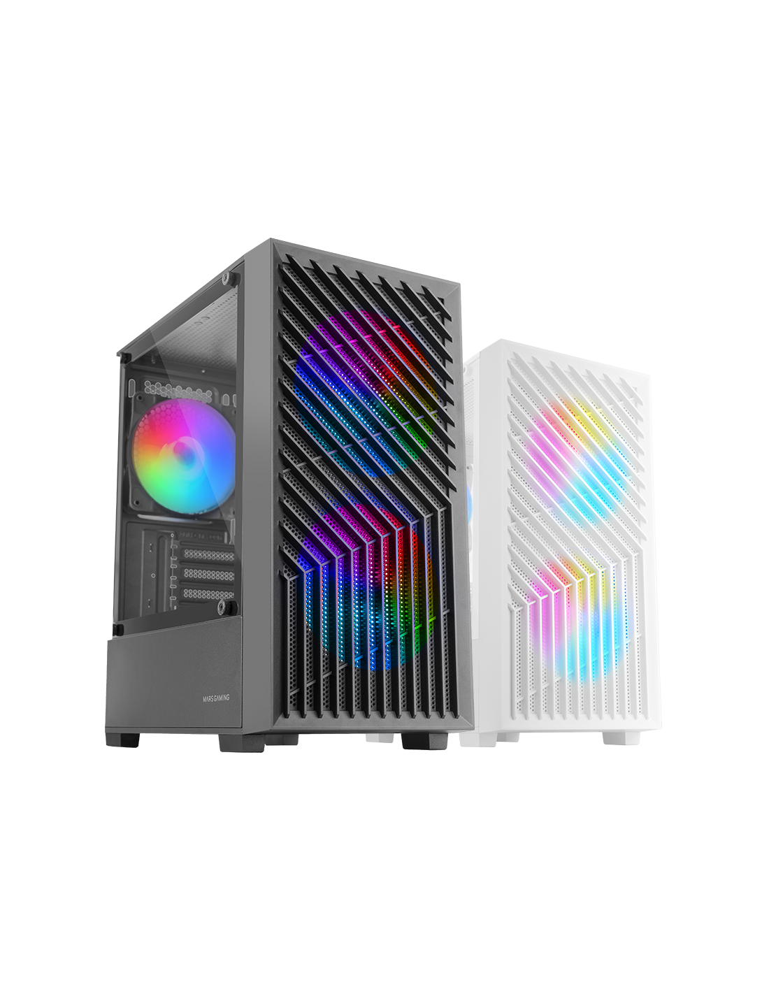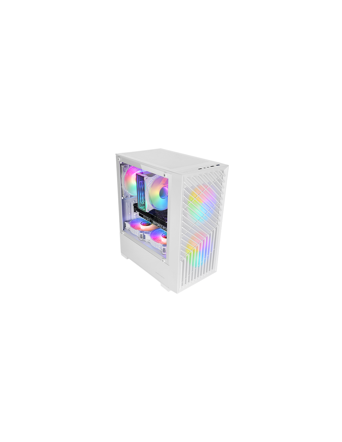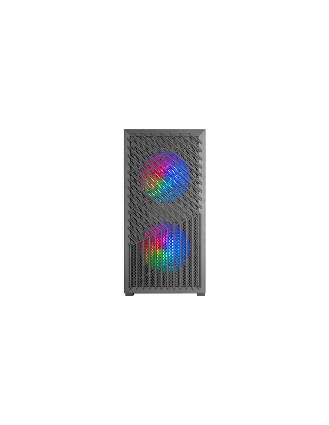 The MC-Vortex is the perfect gaming box for those looking for power in a compact format. Its MicroArtx design with front mesh, tempered glass window and 3 FRGB Rainbow fans offers excellent thermal performance and a spectacular look. With capacity for up to 7 fans, support for liquid cooling, double camera design and space for the most advanced components, MC-Vortex fuses performance, style and functionality.