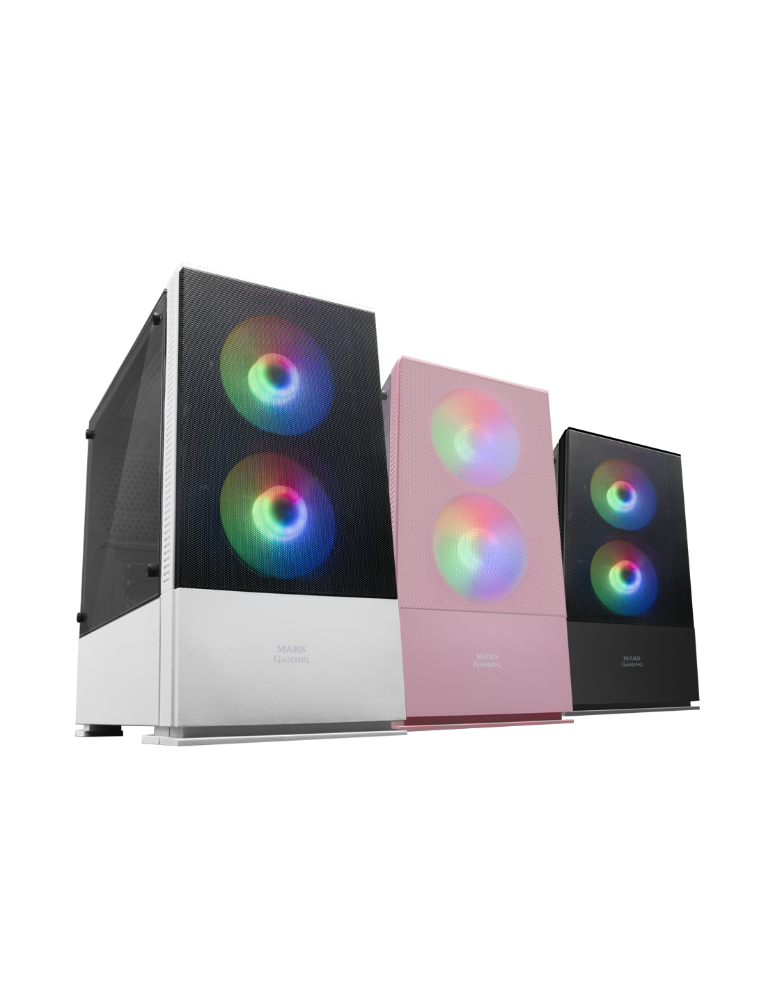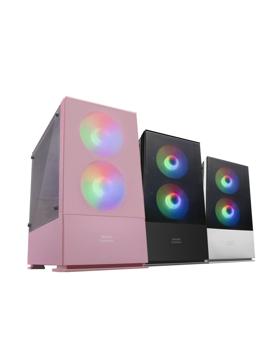 Advanced RGB compact box for high-performance gaming configurations in MicroArtx & Mini-ITX formats. With an outstanding cooling thanks to its 2 fixed FRGB fans, its MESH design front panel, a double-chamber design for the PSU and maximum support for liquid coolings. Available in black, white and exclusive limited edition Full Pink.