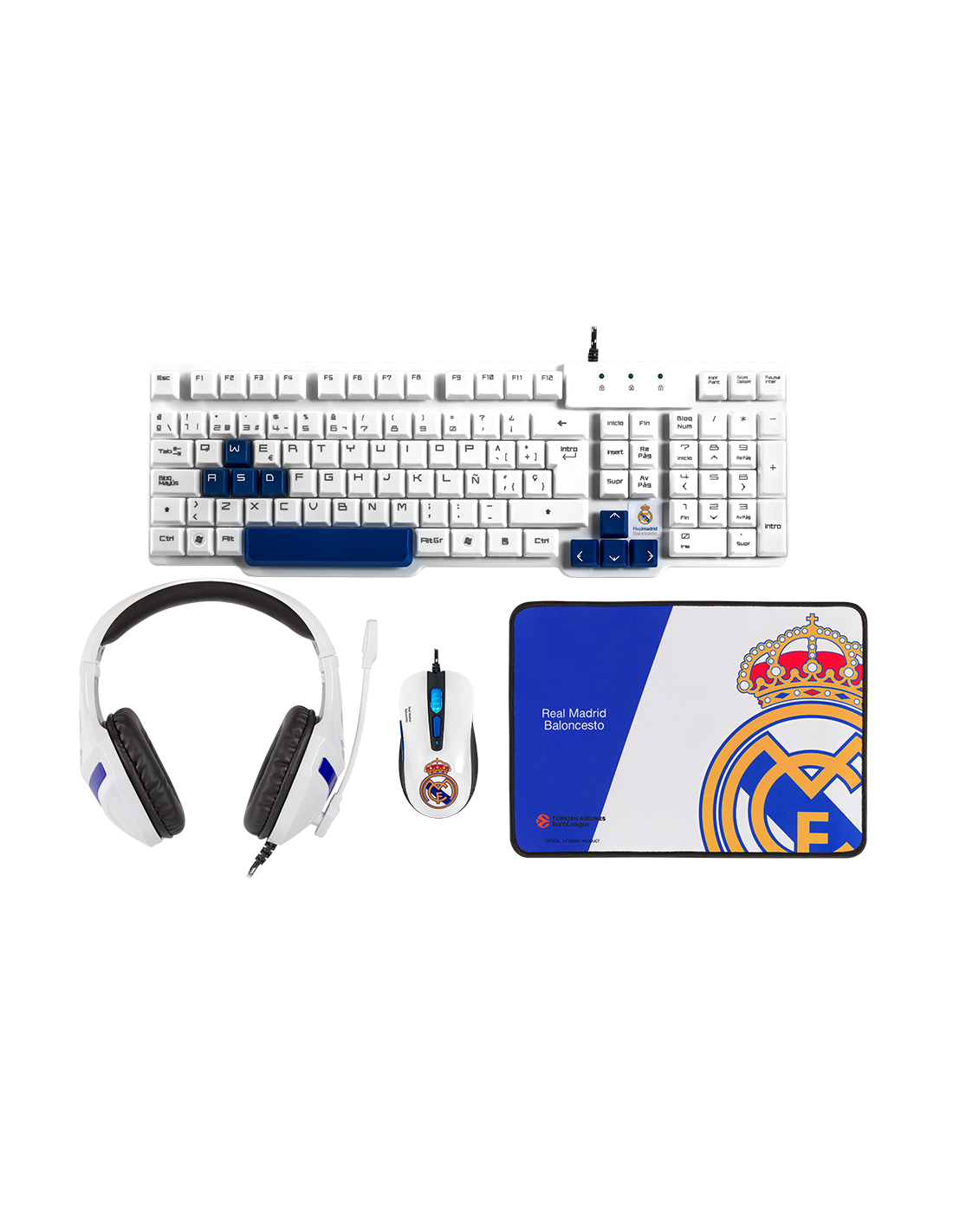 Only for the biggest fans of Real Madrid, comes the definitive gaming pack: mechanical feel keyboard, high-quality gaming headphones, professional mouse with optical sensor, and advanced design mousepad. All products feature the exclusive and official design of Real Madrid and the Euroleague. Feel the colors, show your passion for the team: with the Champion pack, you will enjoy the best features with the most spectacular design.