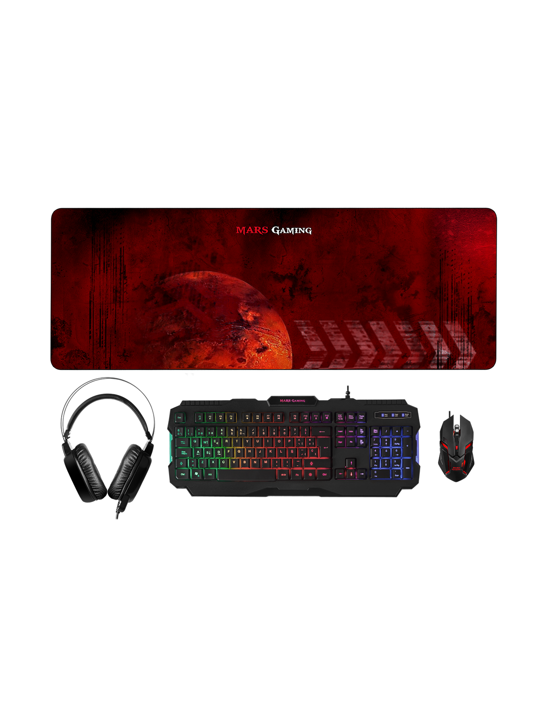 Fill your desk with color with the MCPRGB combo. The RGB Rainbow keyboard, mouse and RGB Flow headphones will turn your gaming sessions into a light show. Protect your keyboard and mouse with the XXL mat with a spectacular red design.