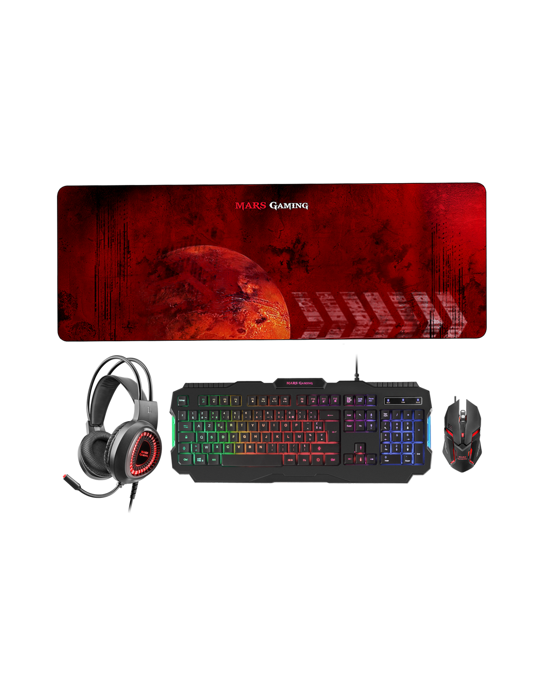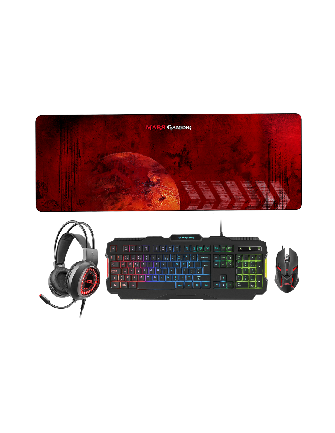 Fill your desktop color with the combo mcprgb2. The RGB Rainbow keyboard, the mouse and the RGB FLOW headphones will convert your Gaming sessions into a light show. Protect your keyboard and mouse with XXL carpet with a spectacular design in red.
