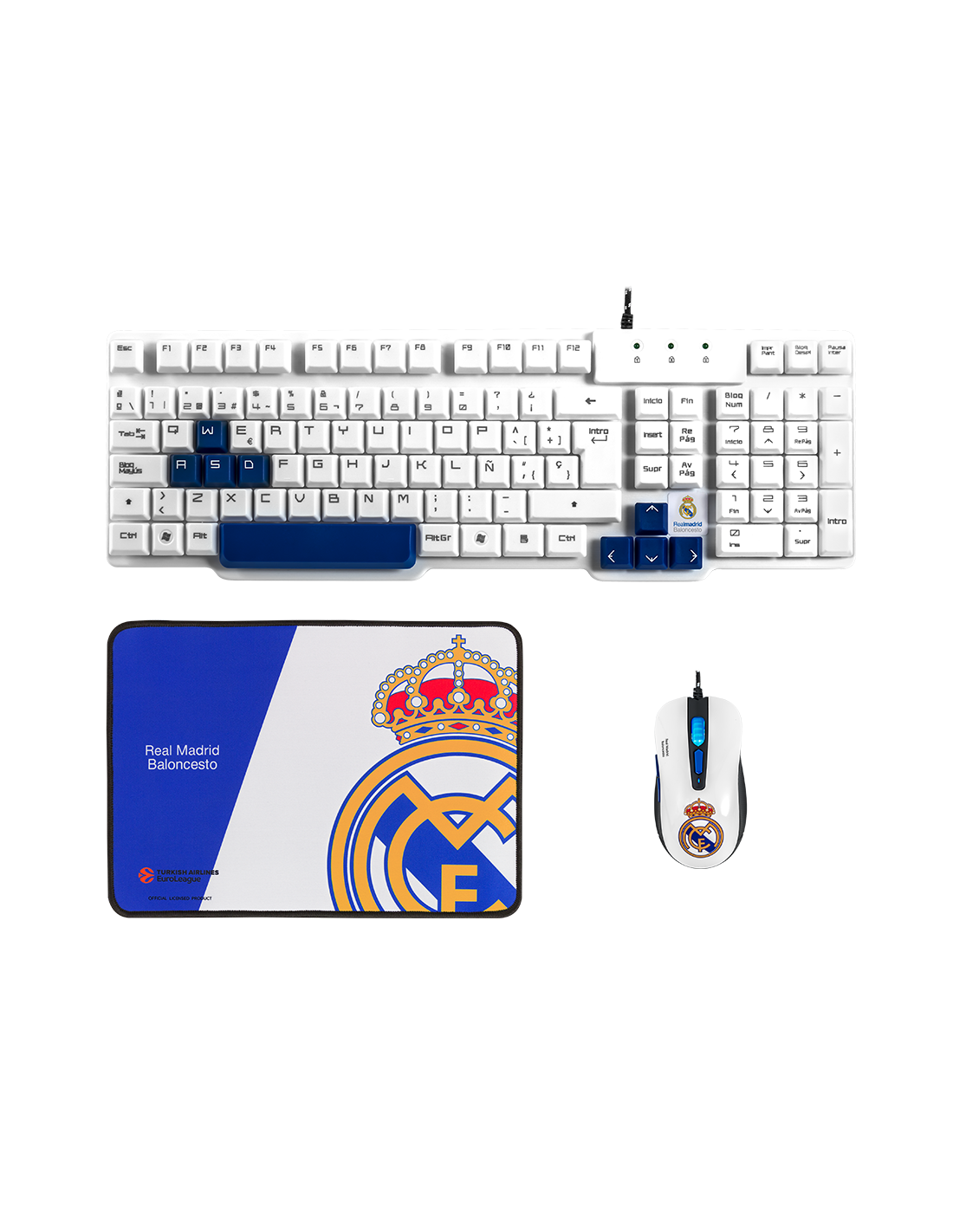 Become the king of the court with the Real Madrid MVP pack! Get a package of products designed for fans of the white club and enjoy the official exclusive design of Real Madrid and the Euroleague with three spectacular peripherals: an ultra-compact professional keyboard, a high-performance optical sensor gaming mouse and a premium quality mat with your team's badge.