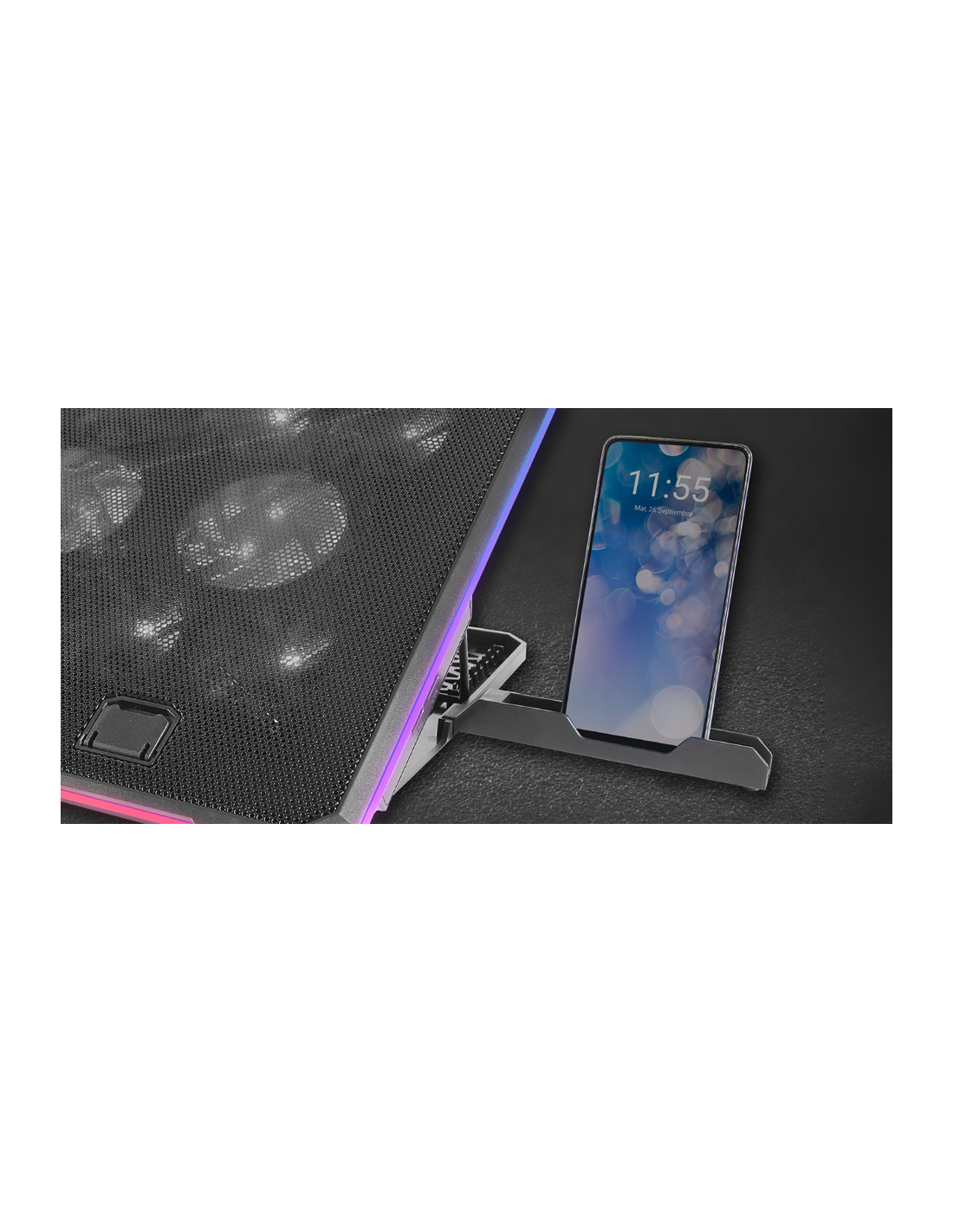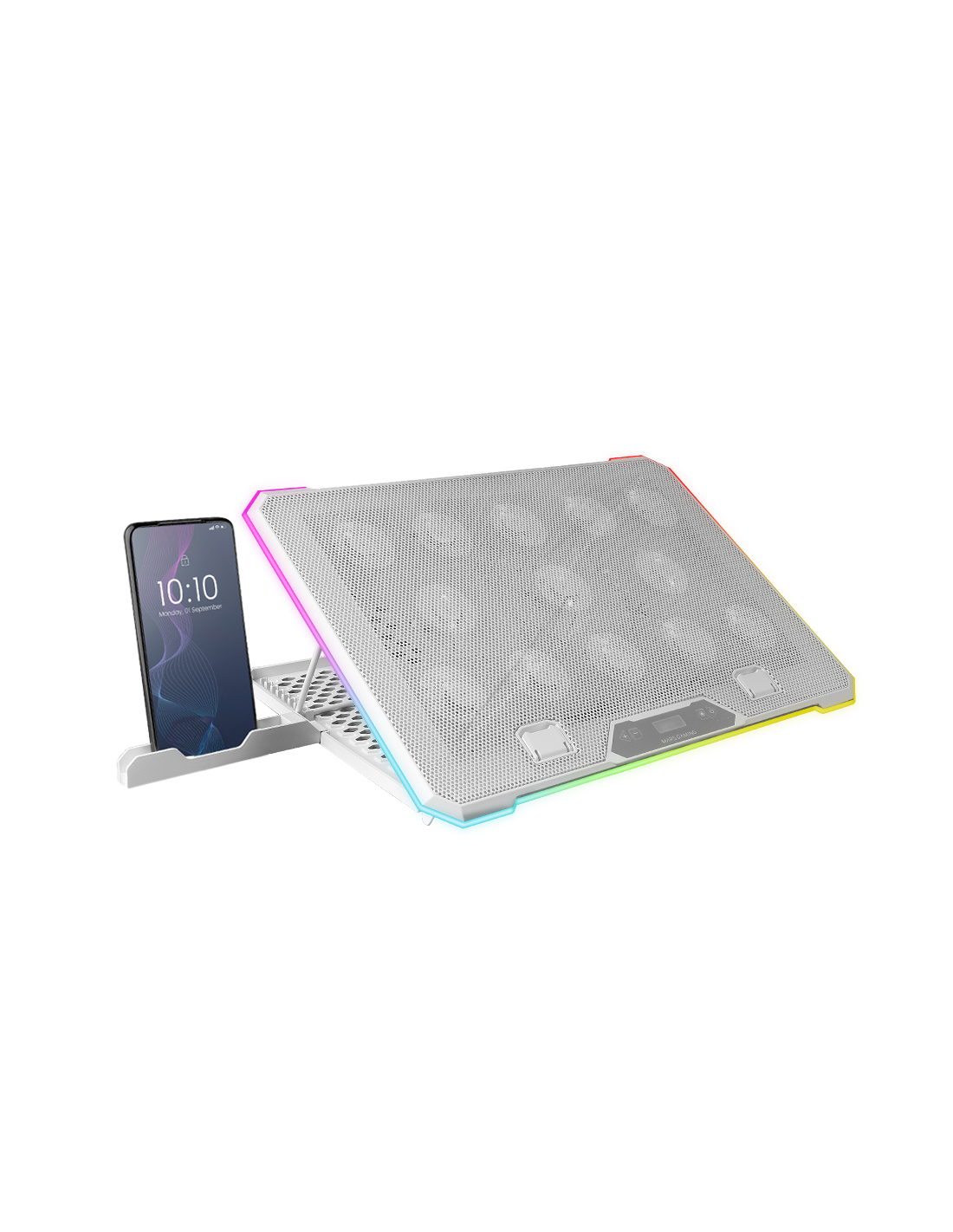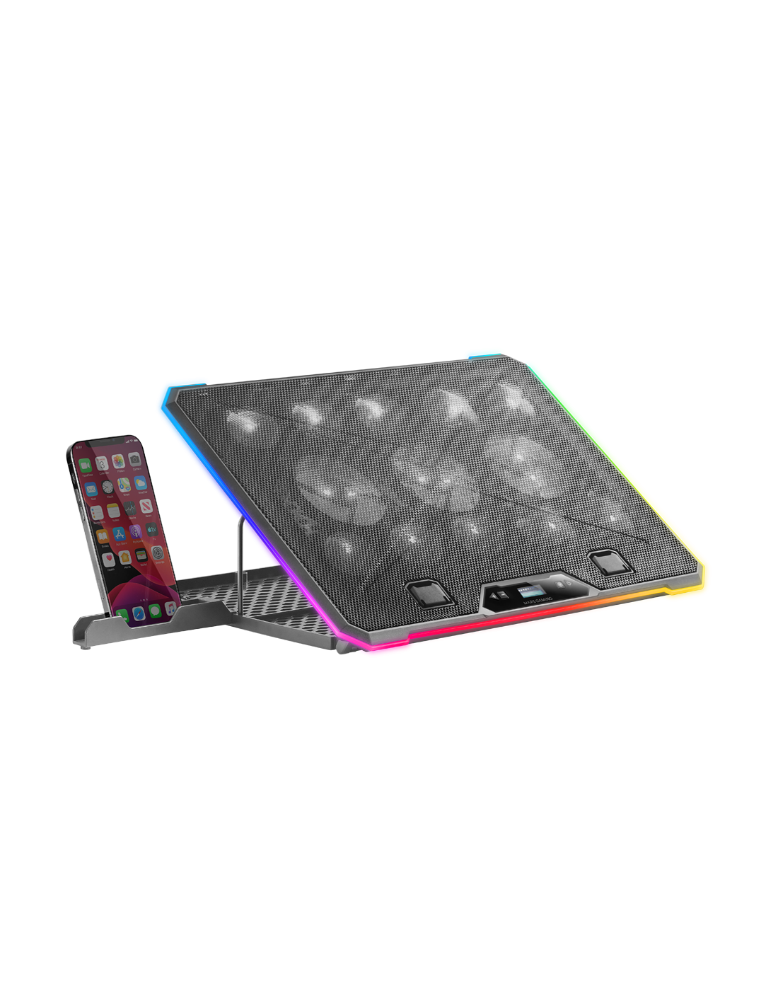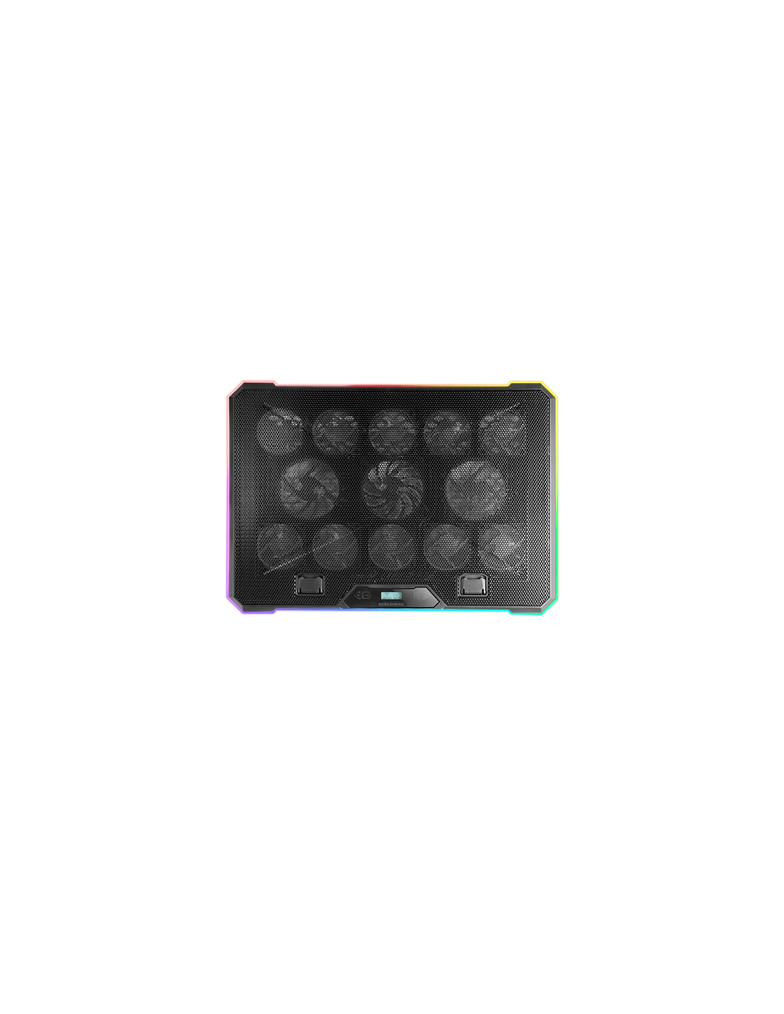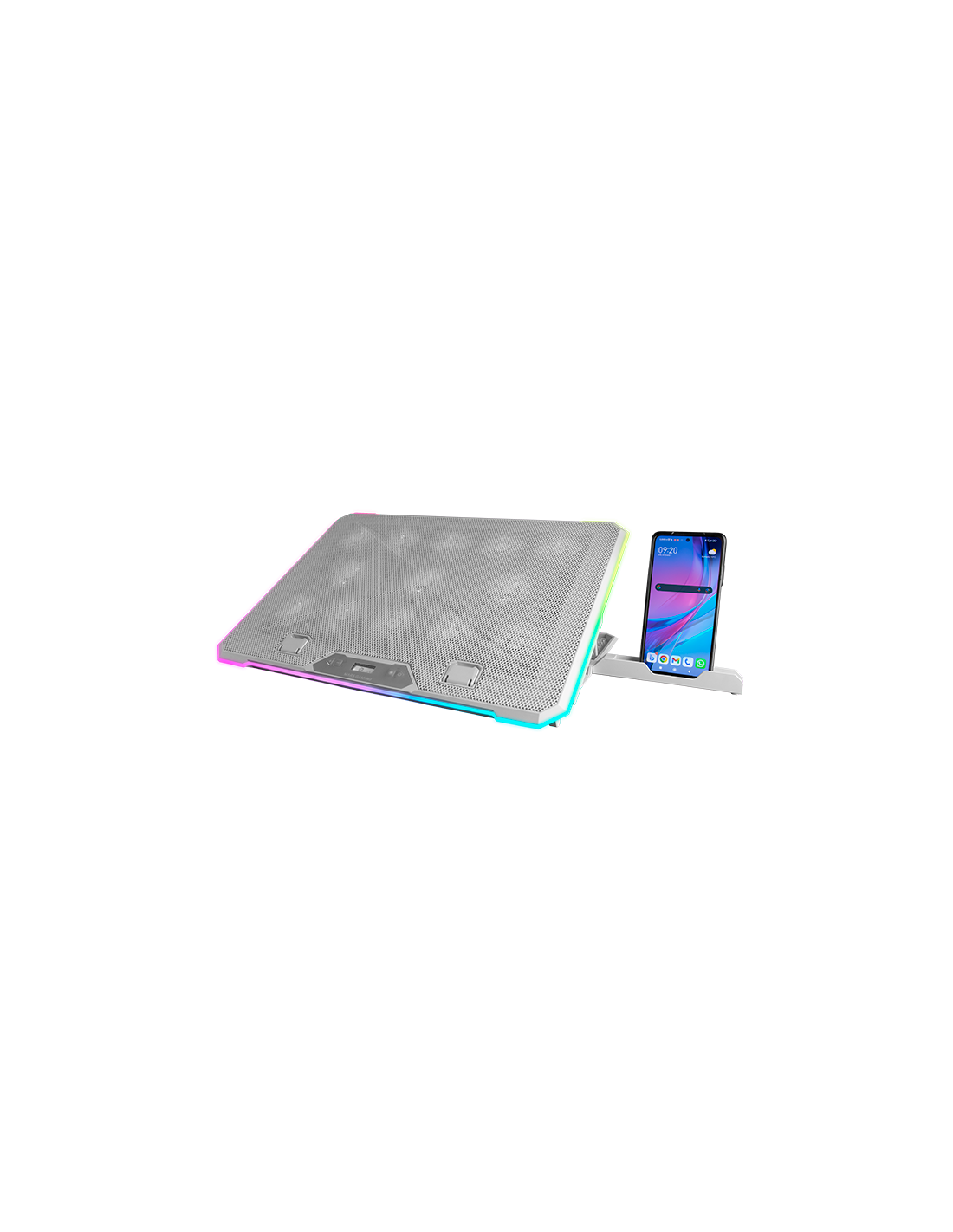 Discover the MNBC13, the final refrigeration base for up to 17 inches, designed to maximize your productivity and gaming experience. With 13 ultrasilence fans and a customizable RGB lighting system, it offers advanced refrigeration and a unique style. Its ergonomic design with stand function, LCD screen, and support for smartphone, along with two USB ports, make it an essential tool for your desktop.