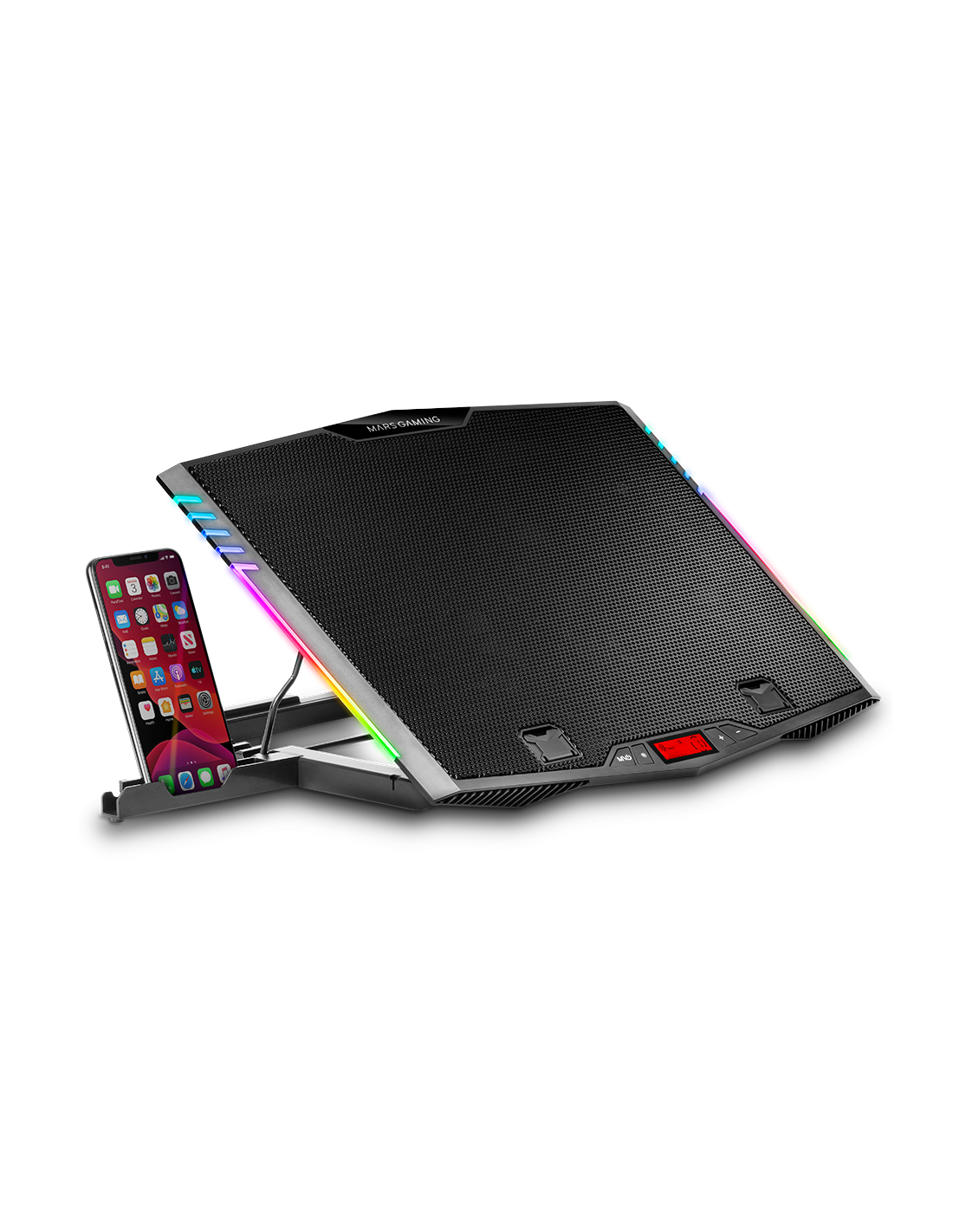 The most advanced laptop cooling base and stand. All you can want at your reach: Spectacular controllable dynamic ArgB lighting, large XL size to support the most powerful laptops, extreme cooling with 6 digitally controlled fans, stand function with 7 selectable positions and an exclusive stand for you Smartphone.