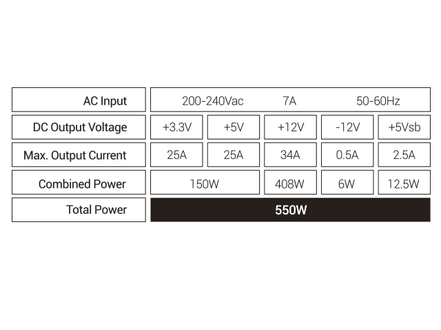 - +3.3V - 25A / +5V - 27A / +12V - 50A / -12V - 0.5A / +5VSB - 2.5A