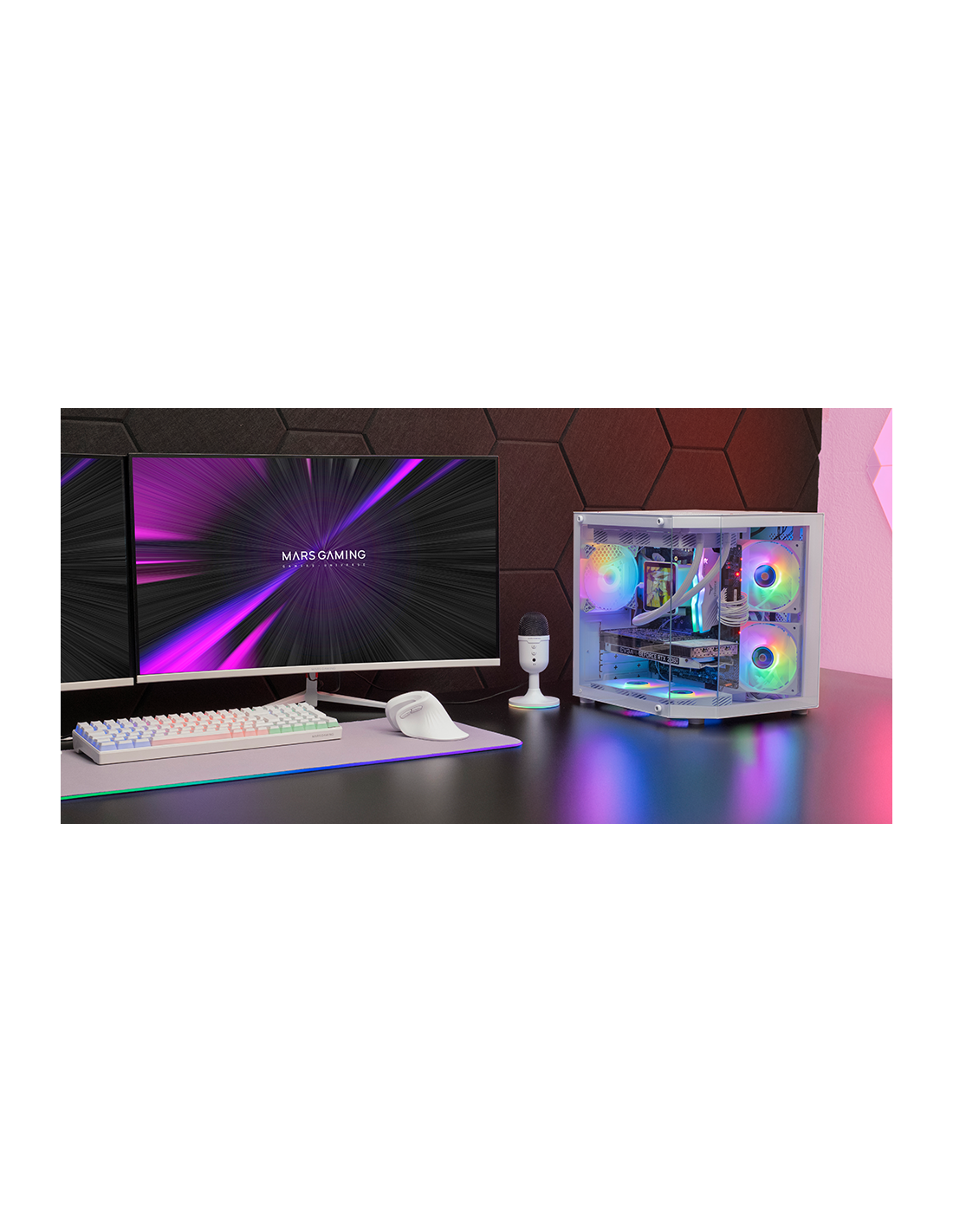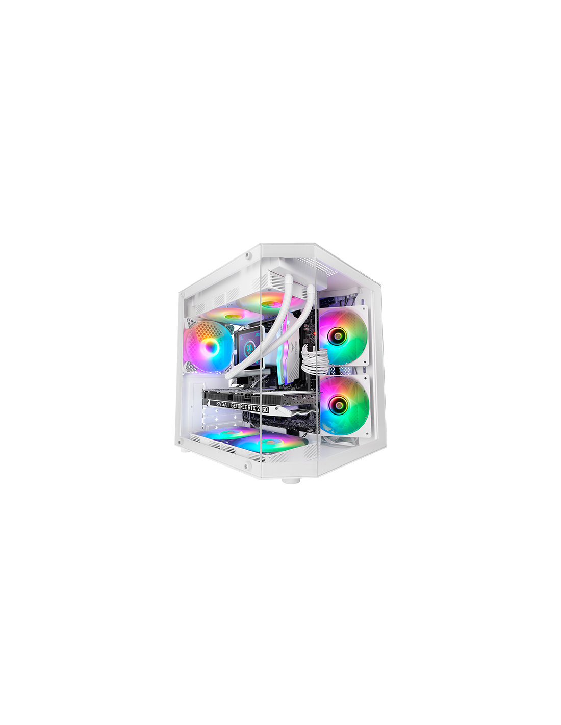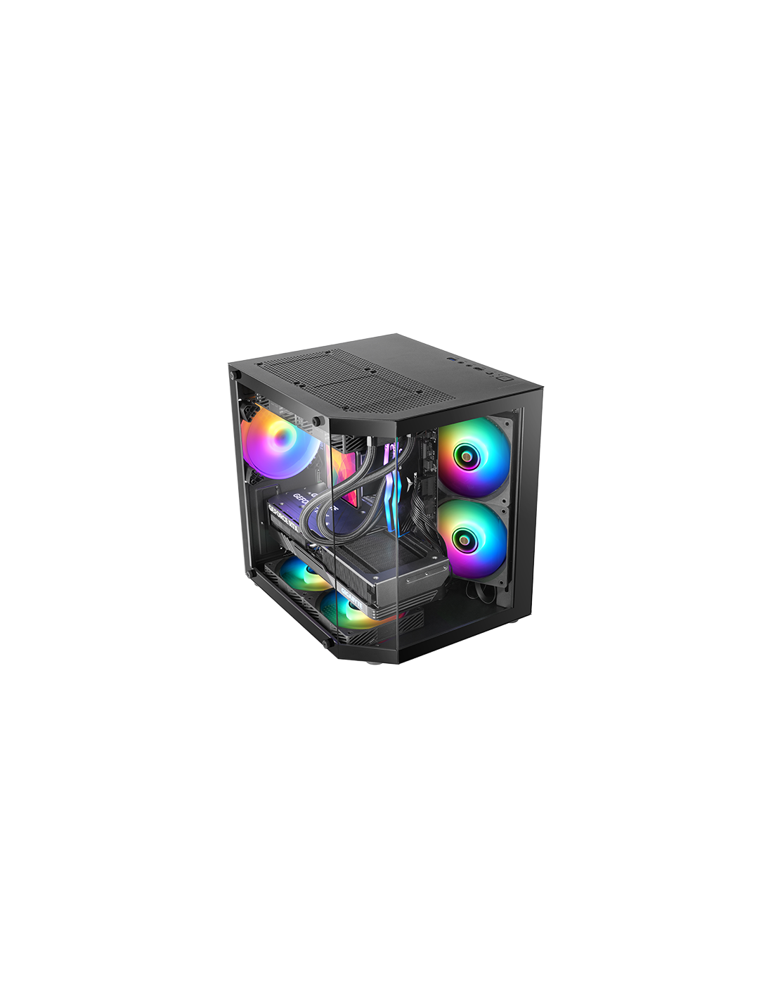 Su diseño panorámico MicroATX compacto con triple cristal templado continuo, estructura de doble cámara y gran capacidad interna te permite mostrar tu hardware con estilo y mantener un rendimiento térmico sobresaliente. Con ventilador trasero FRGB incluido, soporte para hasta 7 ventiladores y refrigeraciones líquidas de hasta 240 mm, está lista para cualquier desafío en el menor espacio