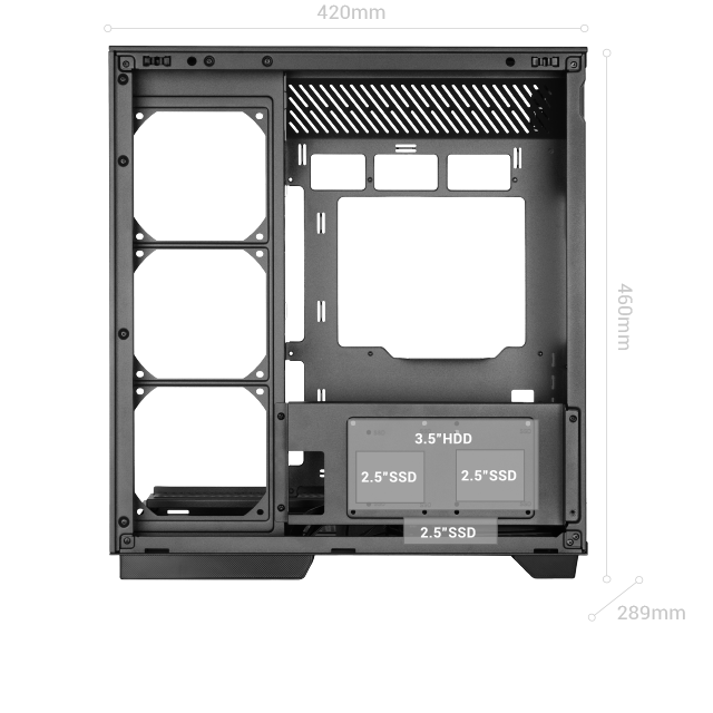 - 360mm, 240mm, 120mm interior / 240mm, 120mm inferior / 120mm trasero