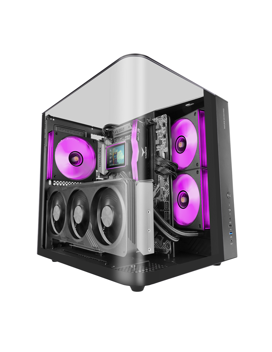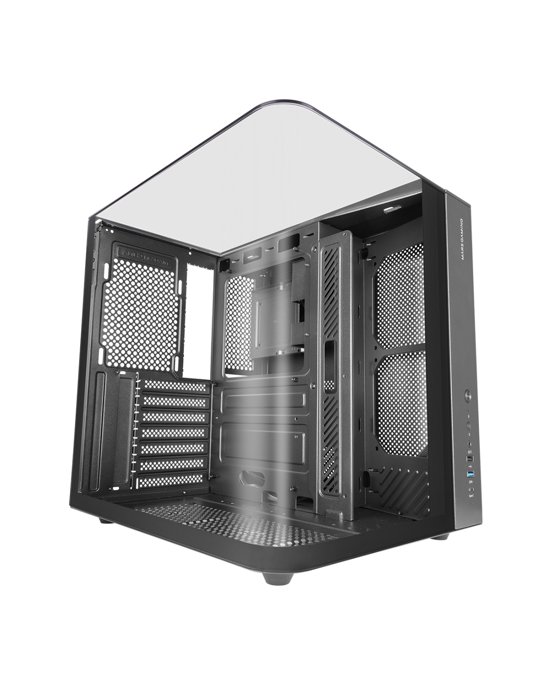 La MC INFINIOLITE lleva el diseño “infinity” de Mars Gaming a un formato más accesible, manteniendo la estética premium y la estructura de doble cámara del modelo INFINIO, pero dejándote libertad total para elegir tu propia refrigeración. Su cristal templado curvado continuo sin marco, combinado con el panel superior también de cristal, ofrece una vista panorámica espectacular del interior, ideal para setups gaming o de creación de contenido que buscan destacar tanto en rendimiento como en imagen.