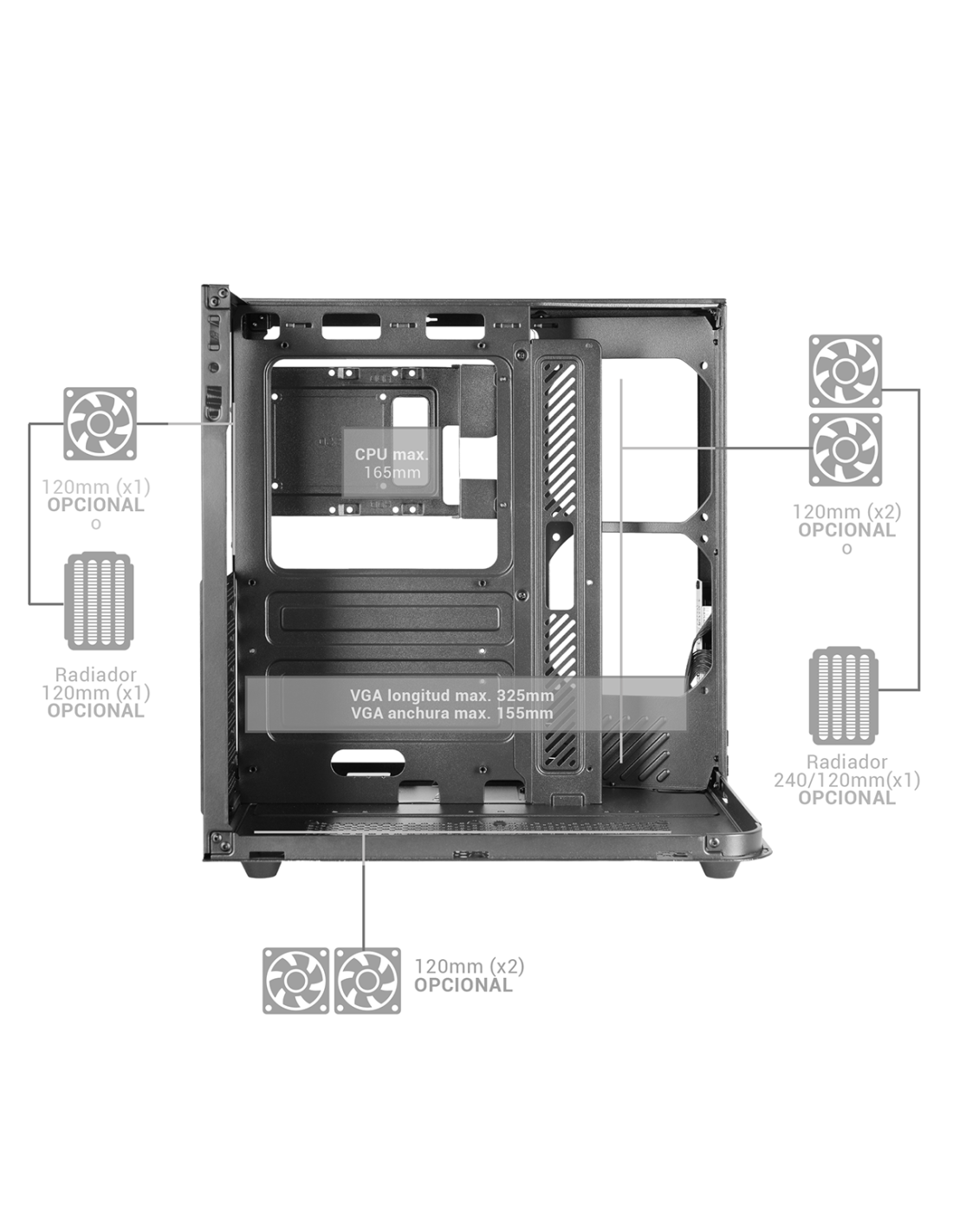 - CPU cooler hasta 165 mm y GPU hasta 325 mm