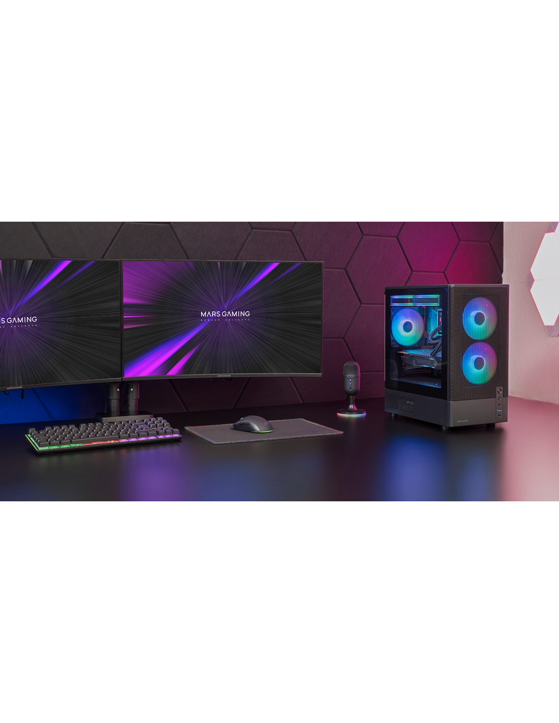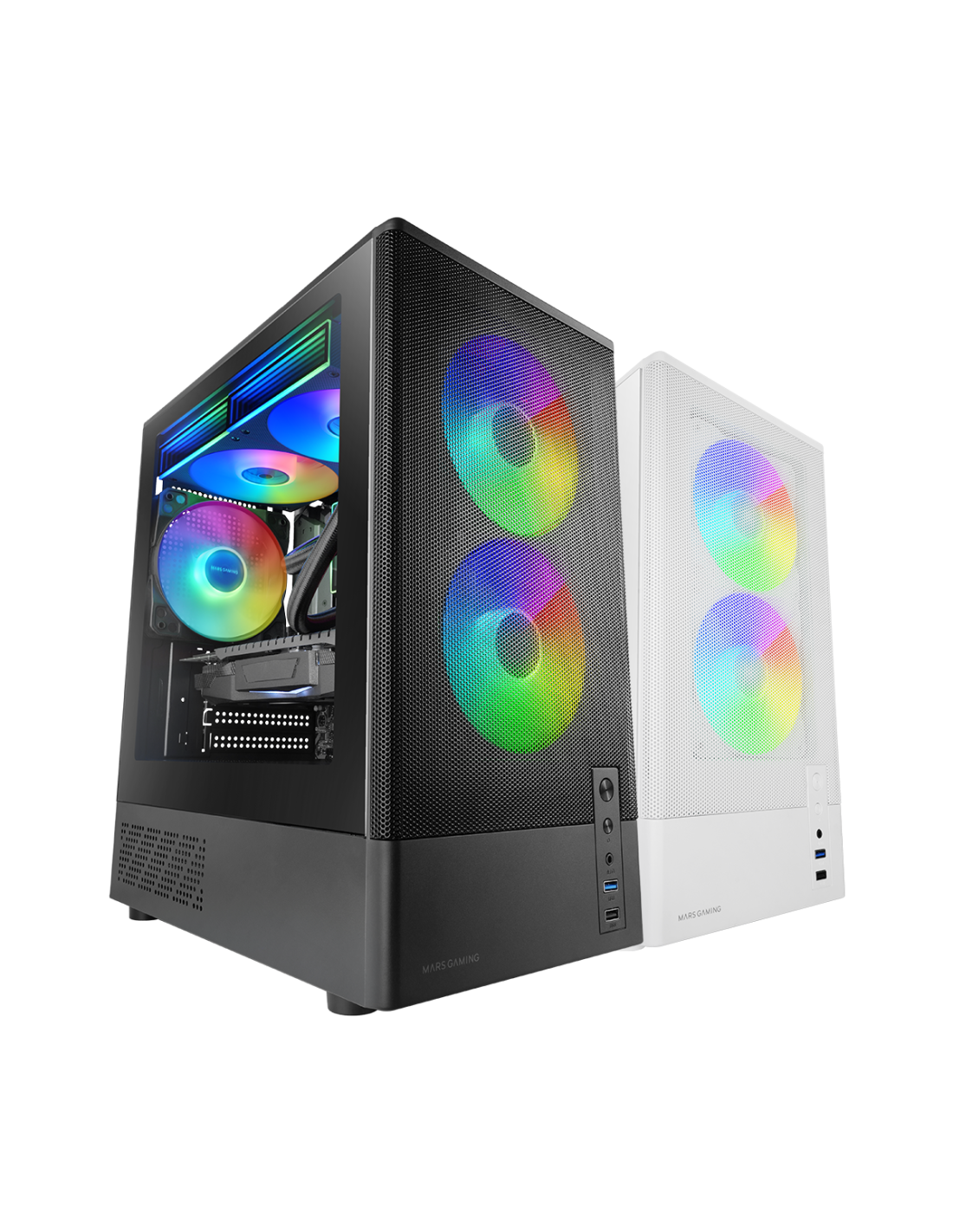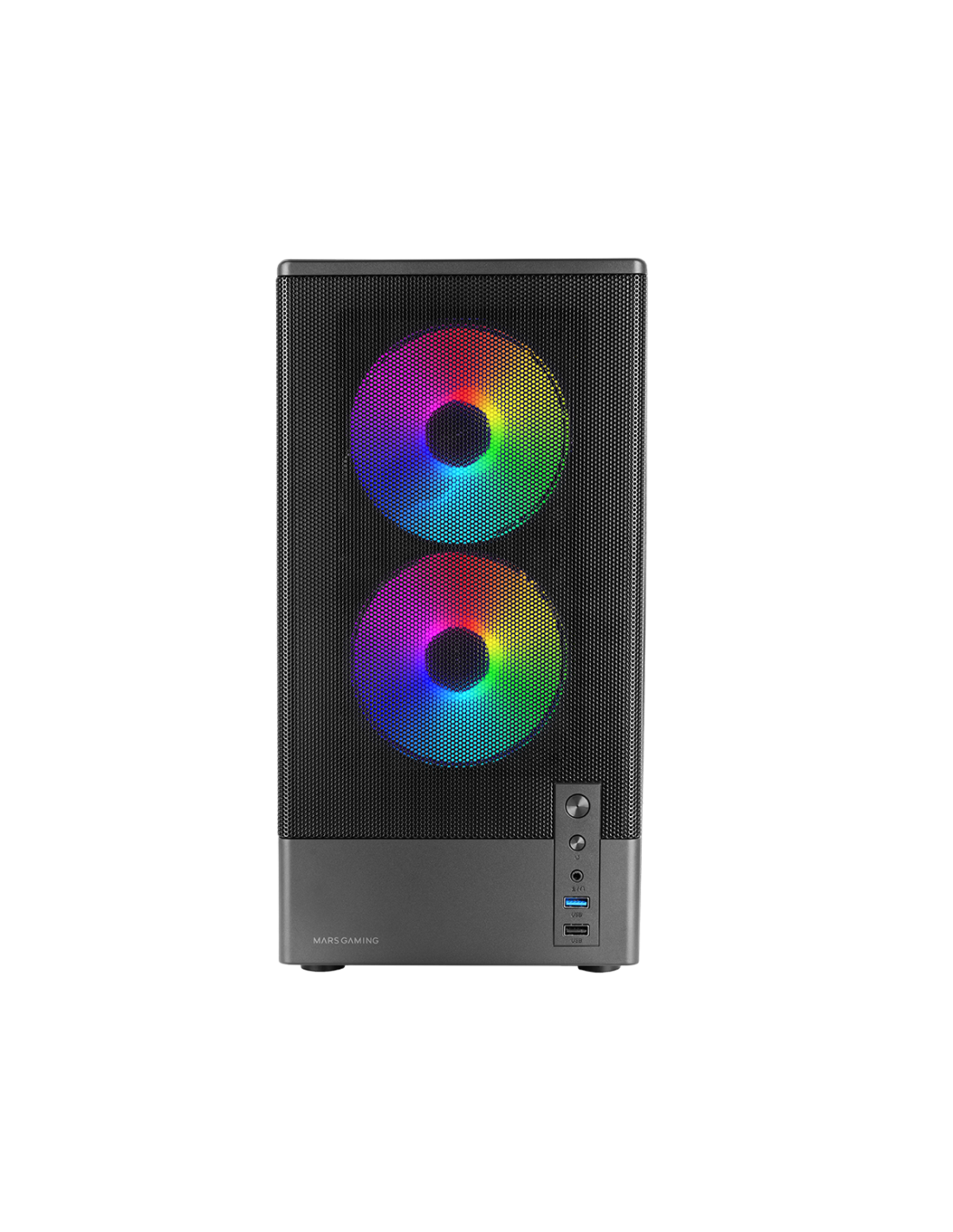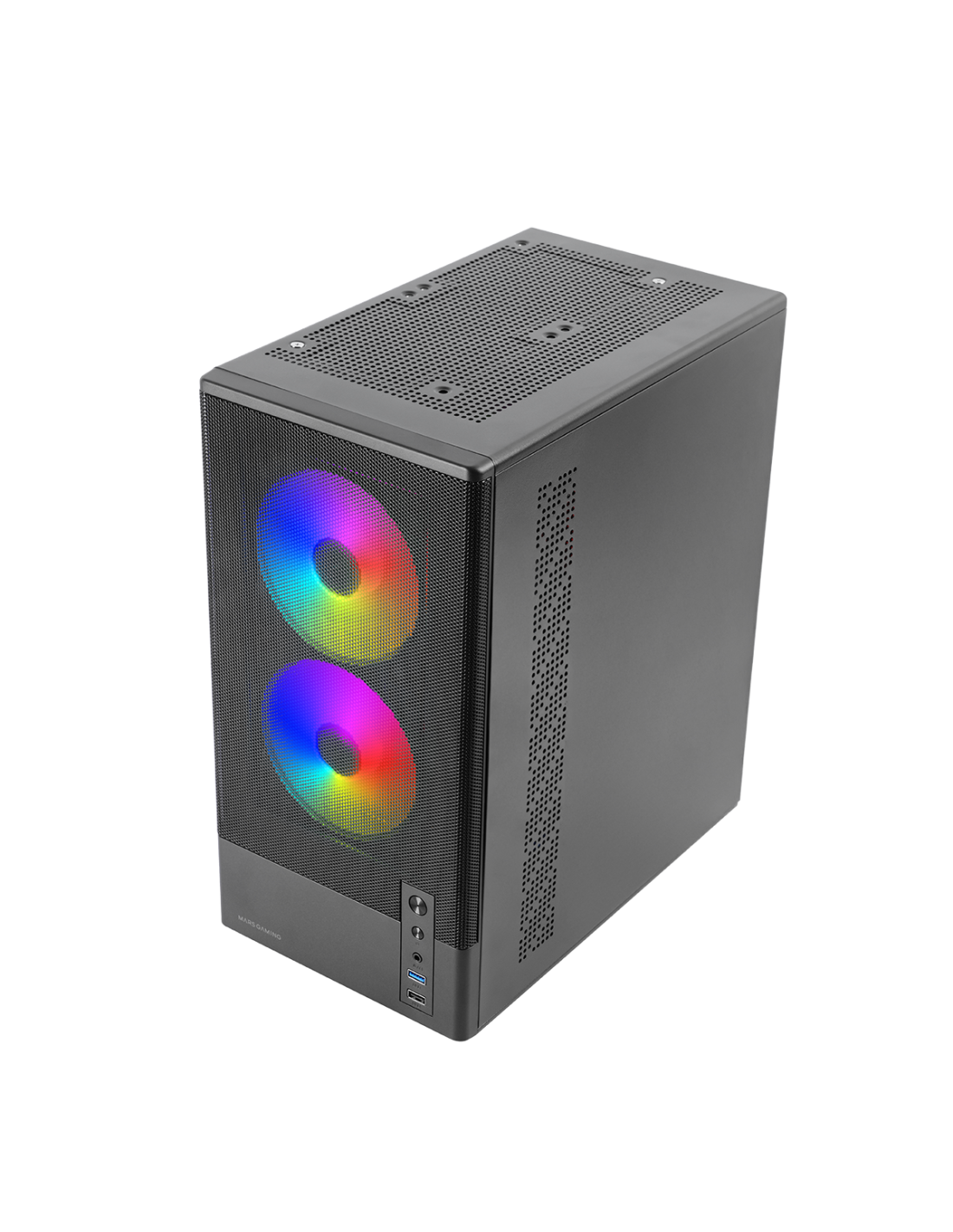 La MC ONYX es una caja microATX de alto rendimiento diseñada para ofrecer airflow extremo en un formato compacto. Su frontal mesh metálico maximiza la entrada de aire, mientras que la ventana lateral de cristal templado muestra tu hardware con claridad. Incluye 3 ventiladores ARGB de 120 mm con rodamientos FDB (2 frontales + 1 trasero) y soporte para refrigeración líquida de hasta 240 mm en la parte superior, además de espacio para hasta 7 ventiladores de 120 mm. Todo ello con fuente en cámara inferior separada, GPU de hasta 292 mm y disipadores de CPU de hasta 165 mm.