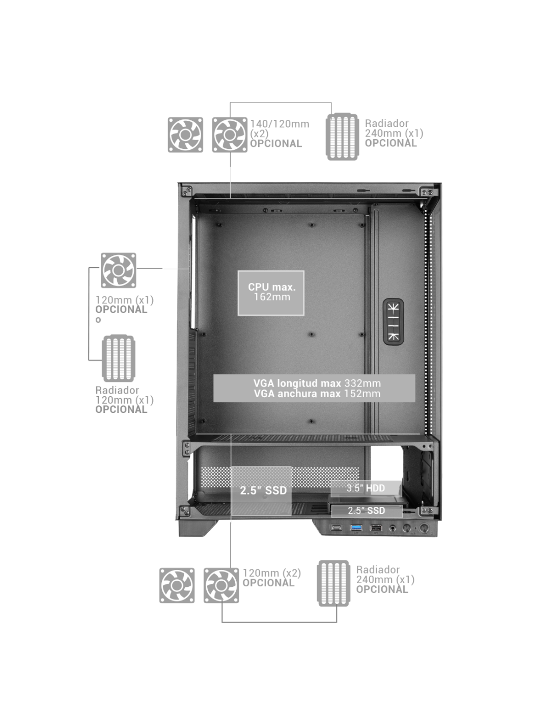 Leer más Leer menos- Pantalla LCD frontal con temperaturas de CPU/GPU y RPM de ventilador en tiempo real