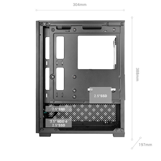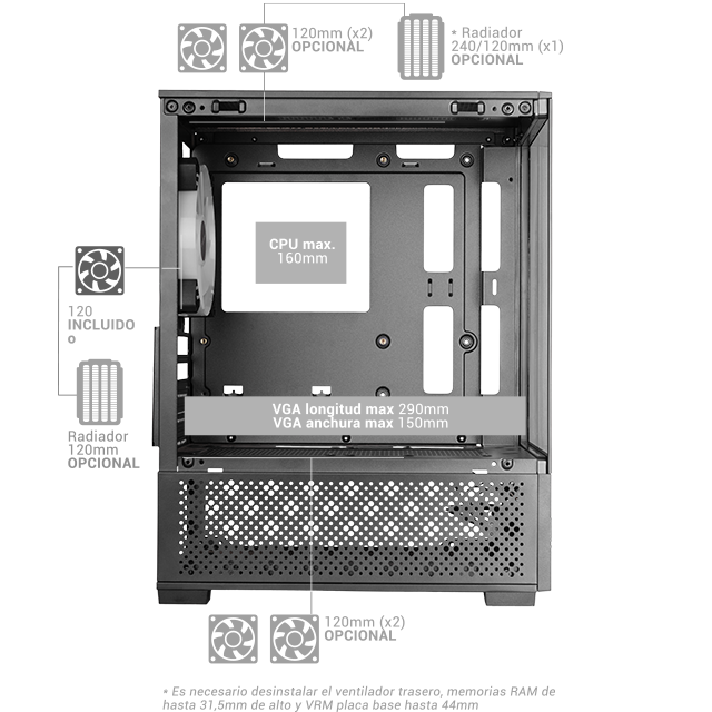 - *240mm, *120mm superior / 120mm trasero *(Es necesario desinstalar el ventilador trasero, memorias RAM de hasta 31,5mm de alto y VRM placa base hasta 44mm)