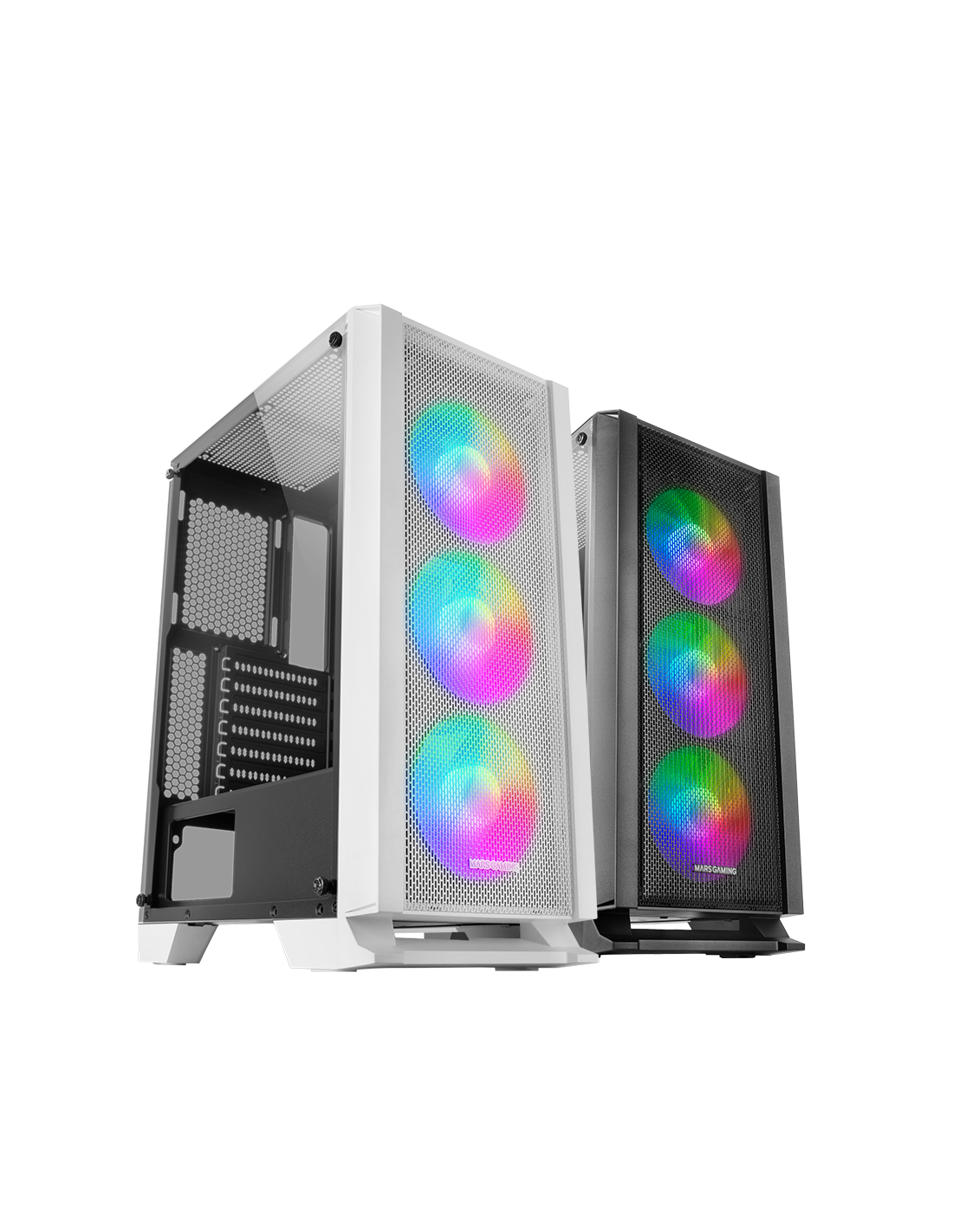 Diseño Gaming Profesional, triple refrigeración de serie para PCs de rendimiento extremo, iluminación FRGB, ventana de cristal templado, soporte completo para refrigeración líquida y un panel frontal en rejilla METAL-MESH.