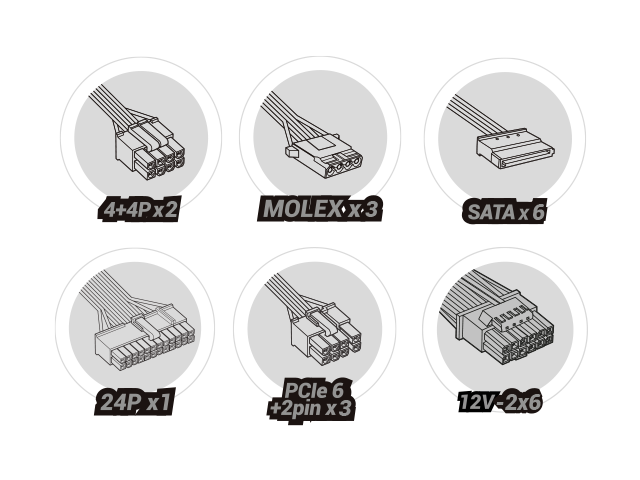 - · 1x ATX MB 24 PIN · 2x EPS +12V 4+4 PIN · 2x PCIe 6+2 PIN · 6x SATA · 3x Molex 4 PIN · 1x 12V-2x6 PIN