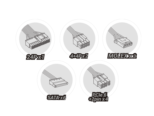 - · 1x ATX MB 24 PIN · 2x EPS +12V 4+4 PIN · 4x PCIe 6+2 PIN · 6x SATA · 3x Molex 4 PIN · 1x Puerto 12V-2x6 PIN (CABLE NO INCLUIDO)