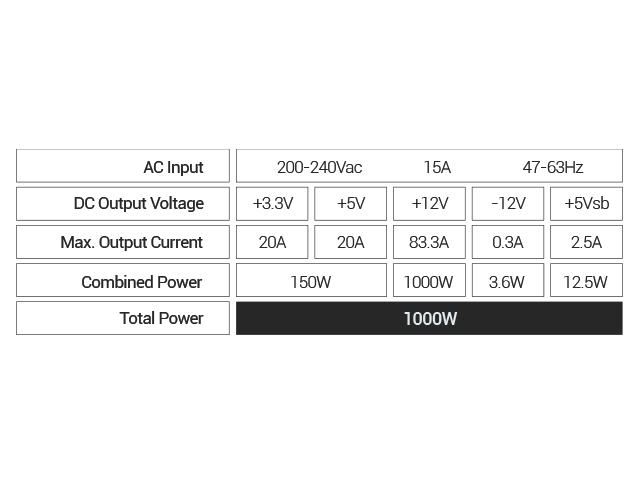 - +3.3V - 20A / +5V - 20A / +12V - 83.3A / -12V - 0.3A / +5VSB - 2.5A