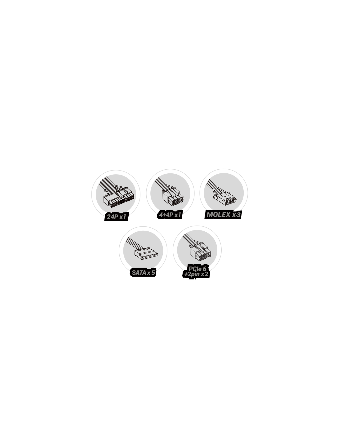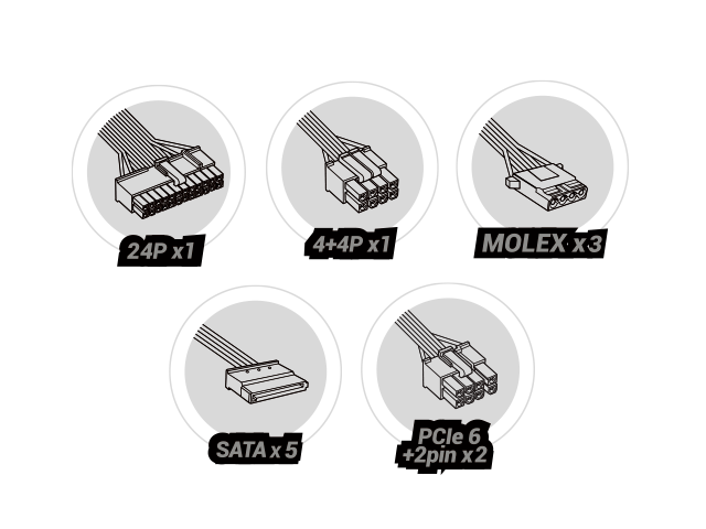 - 1x ATX MB 24 PIN (500mm) / 1x EPS +12V 4+4 PIN (500mm) / 2x PCIe 6+2 PIN (450mm) / 5x SATA / 3x Molex 4 PIN