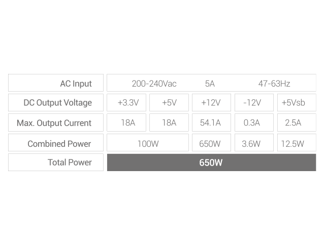 - +3.3V - 18A / +5V - 18A / +12V - 54.1A / -12V - 0.3A / +5VSB - 2.5A