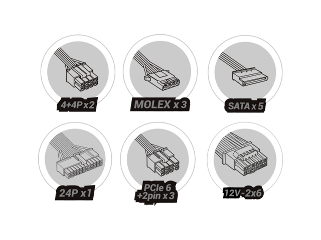 - · 1x ATX MB 24 PIN · 2x EPS +12V 4+4 PIN · 3x PCIe 6+2 PIN · 5x SATA · 3x Molex 4 PIN · 1x 12V 2x6 PIN