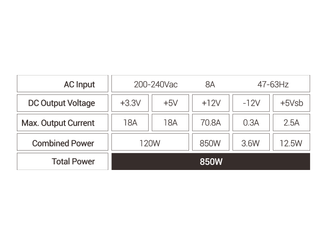 - +3.3V - 18A / +5V - 18A / +12V - 70.8A / -12V - 0.3A / +5VSB - 2.5A