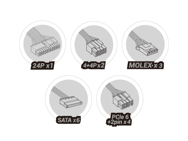 - · 1x ATX MB 24 PIN · 2x EPS +12V 4+4 PIN · 6x SATA · 3x Molex 4 PIN · 4x PCIe 6+2 PIN