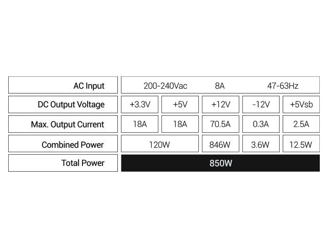 - +3.3V - 18A / +5V - 18A / +12V - 70.5A / -12V - 0.3A / +5VSB - 2.5A