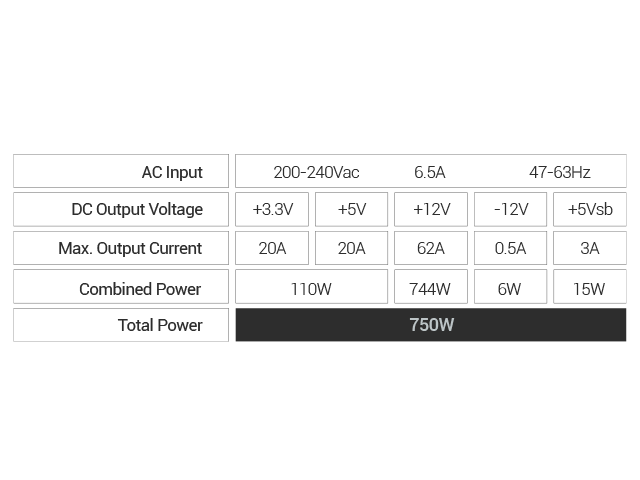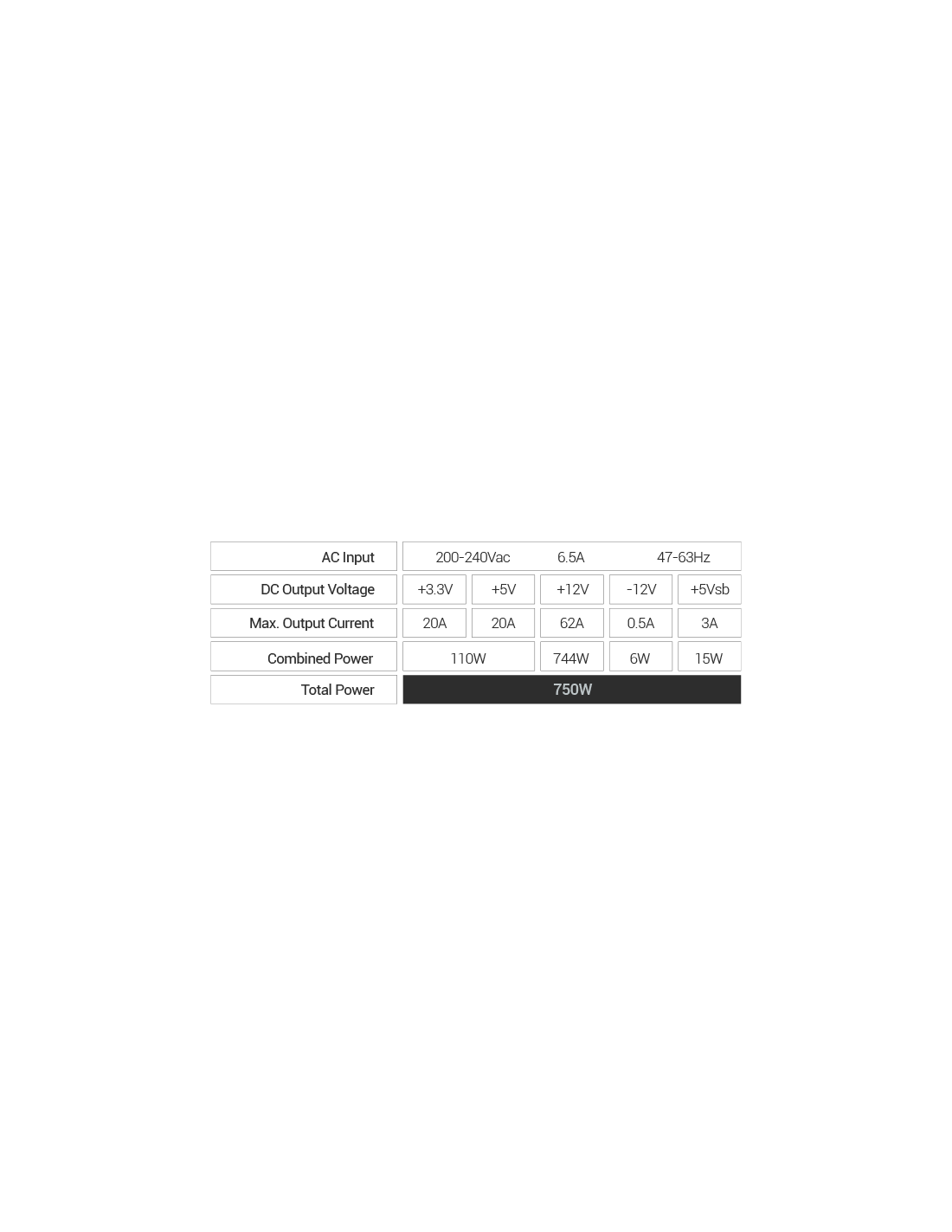 - +3.3V - 20A / +5V - 20A / +12V - 62A / -12V - 0.5A / +5VSB - 3A