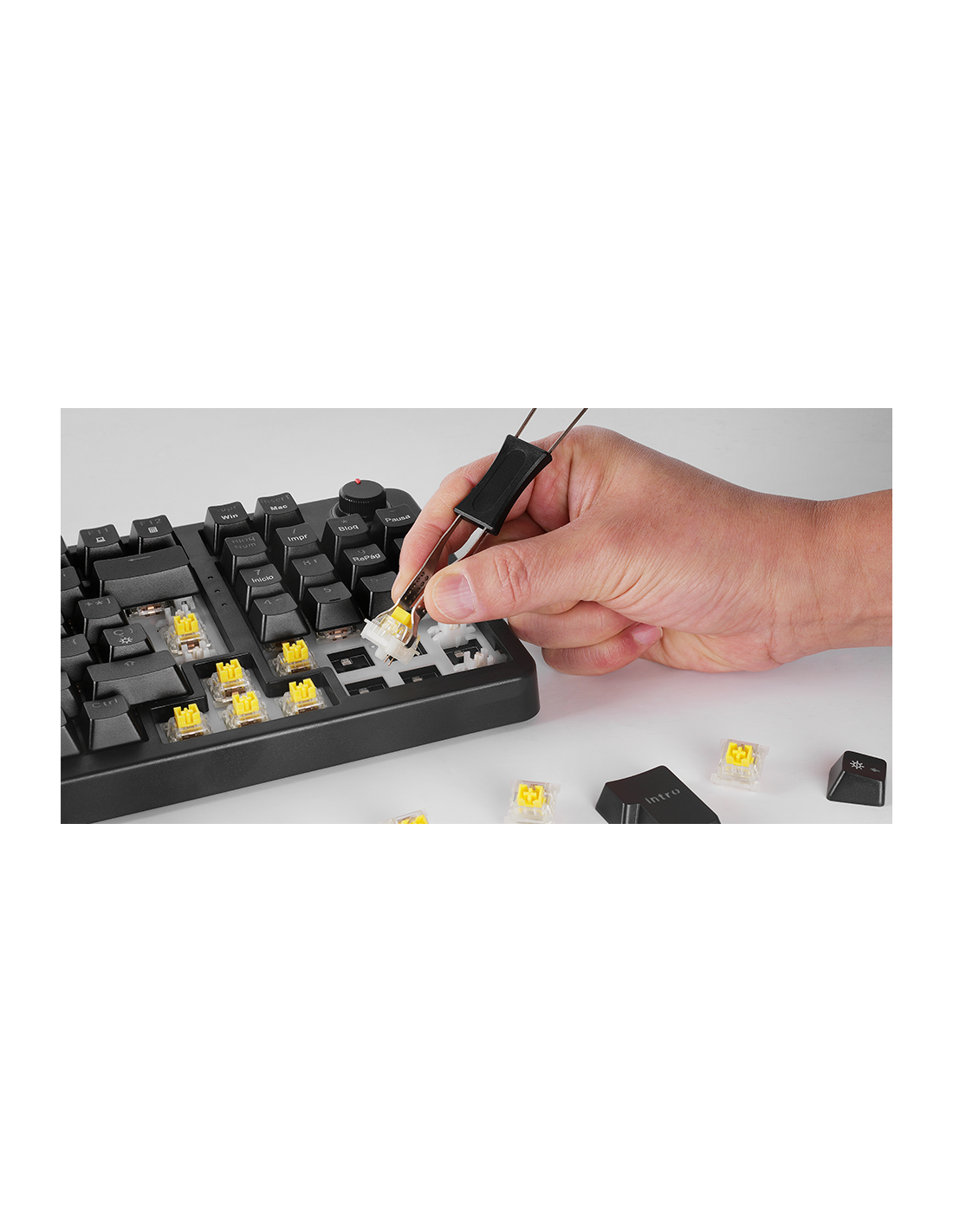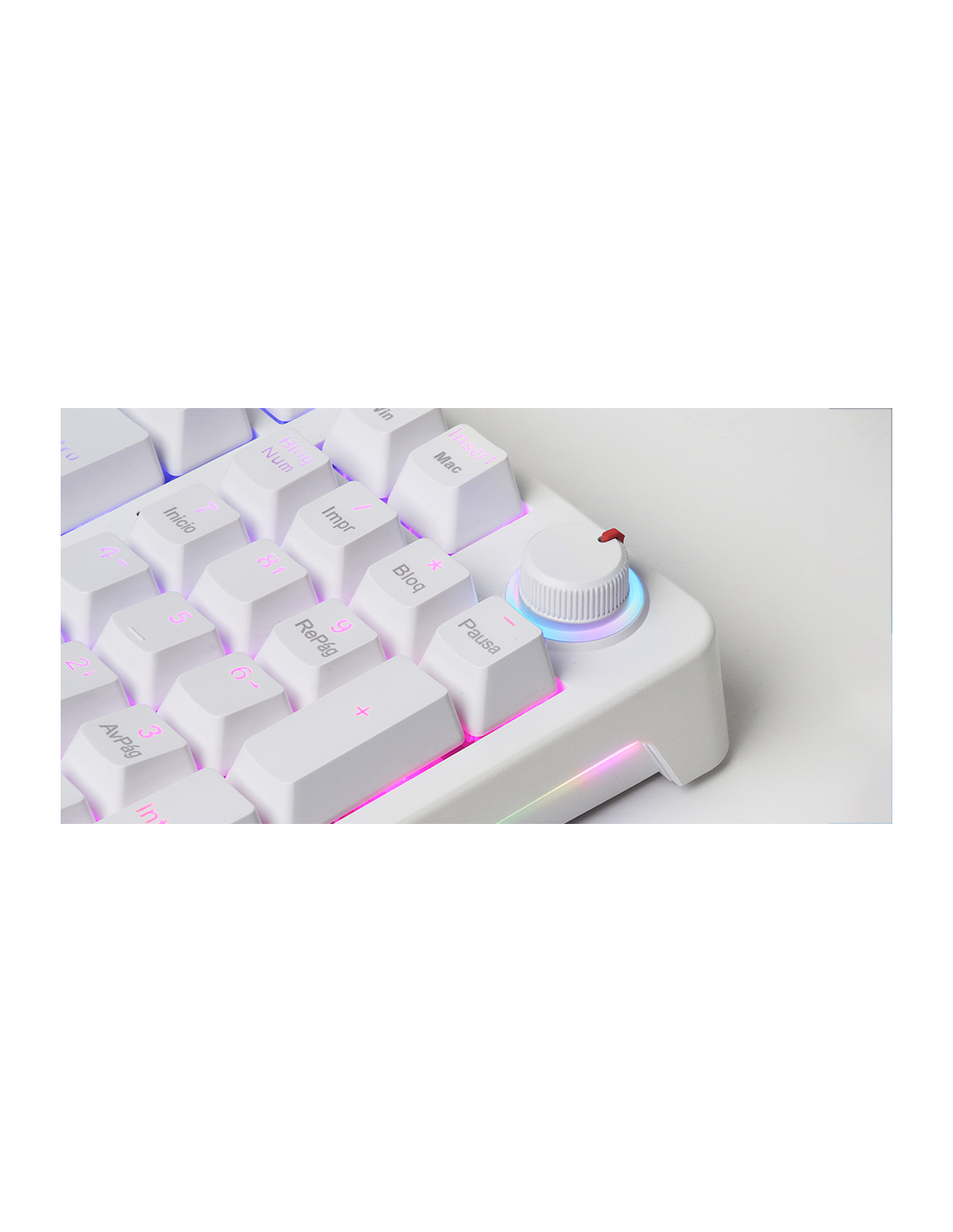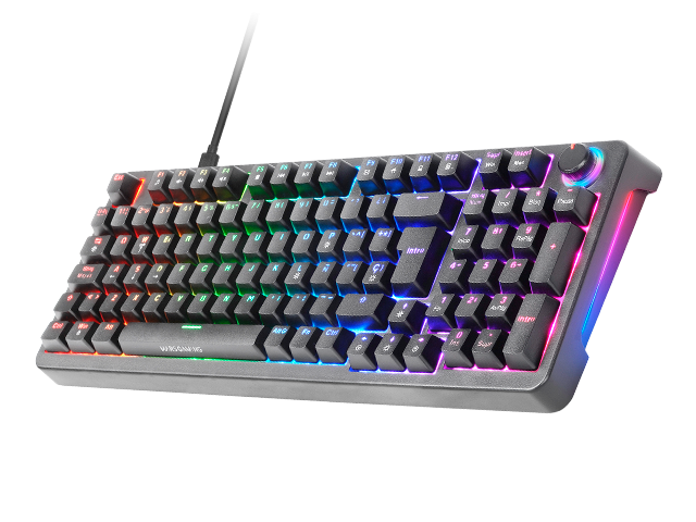 El MKPRO es el teclado mecánico definitivo para quienes buscan rendimiento profesional, personalización avanzada y máxima comodidad. Con un formato completo, incorpora una rueda de control multifunción que permite ajustar el volumen, gestionar funciones multimedia y personalizar la experiencia con facilidad. Su diseño combina teclas mecánicas hot-swappable, iluminación RGB y la tecnología QuietCore, asegurando una experiencia de escritura y gaming fluida y silenciosa.