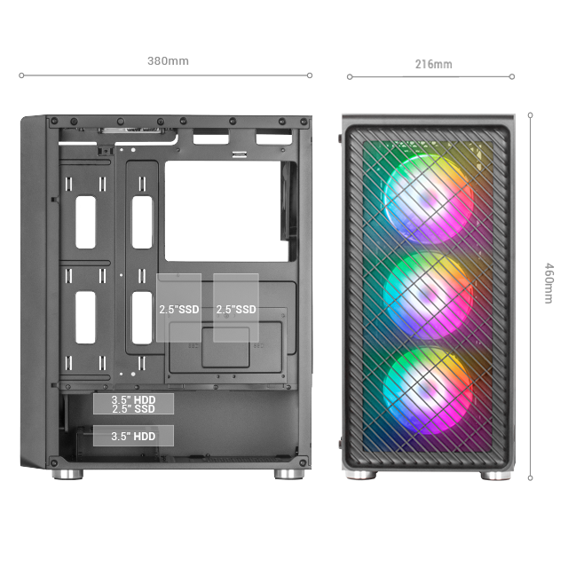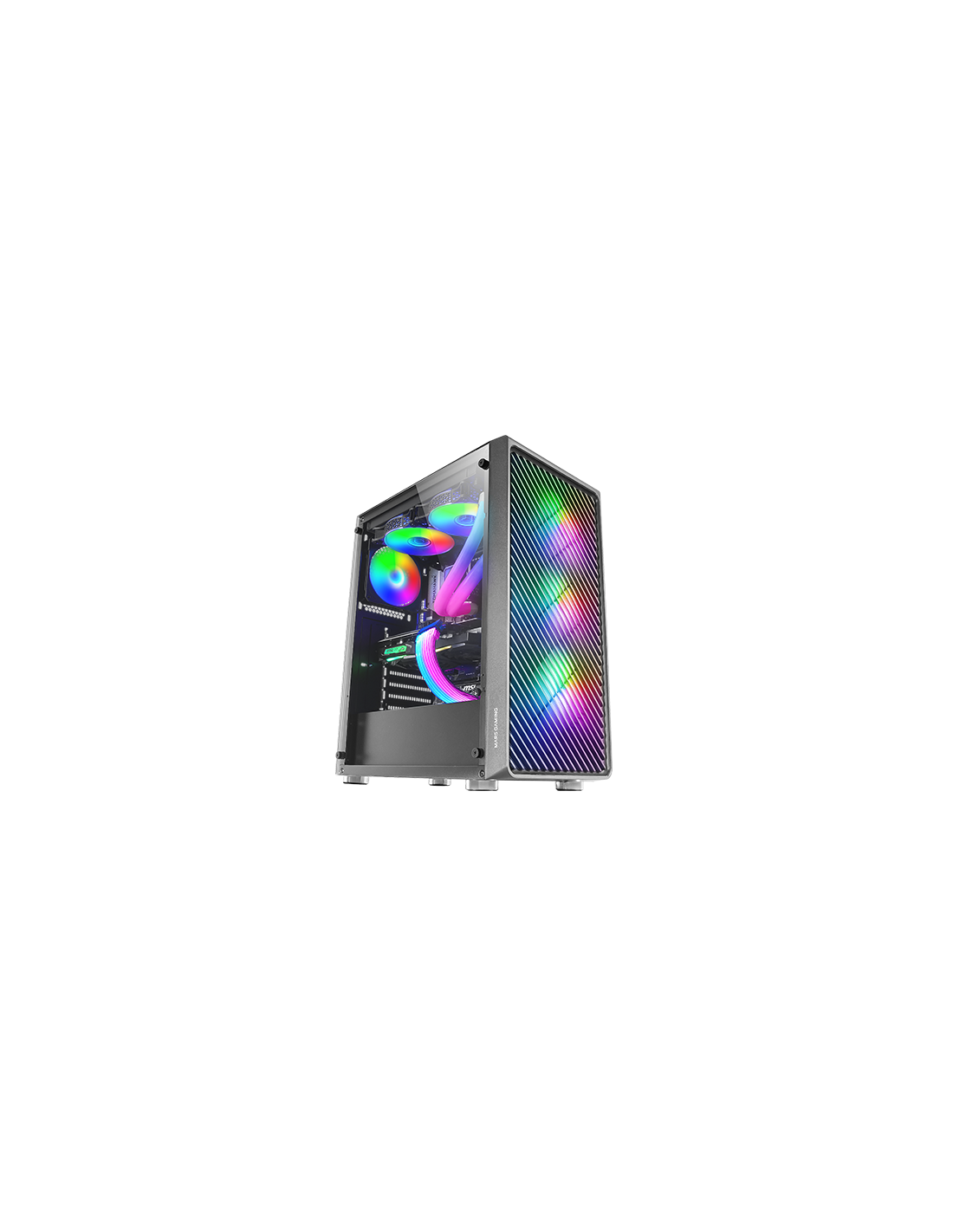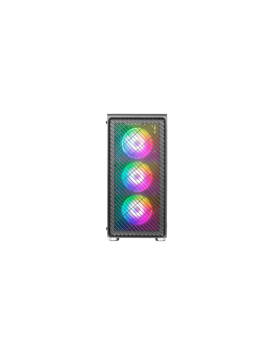 4 ventilateurs ARGB standard pour PC de performance extrême, fenêtre en verre trempé, support complet pour le refroidissement liquide et panneau frontal en METAL-MESH avec un design aérodynamique qui améliore son apparence en combinant refroidissement et éclairage.
