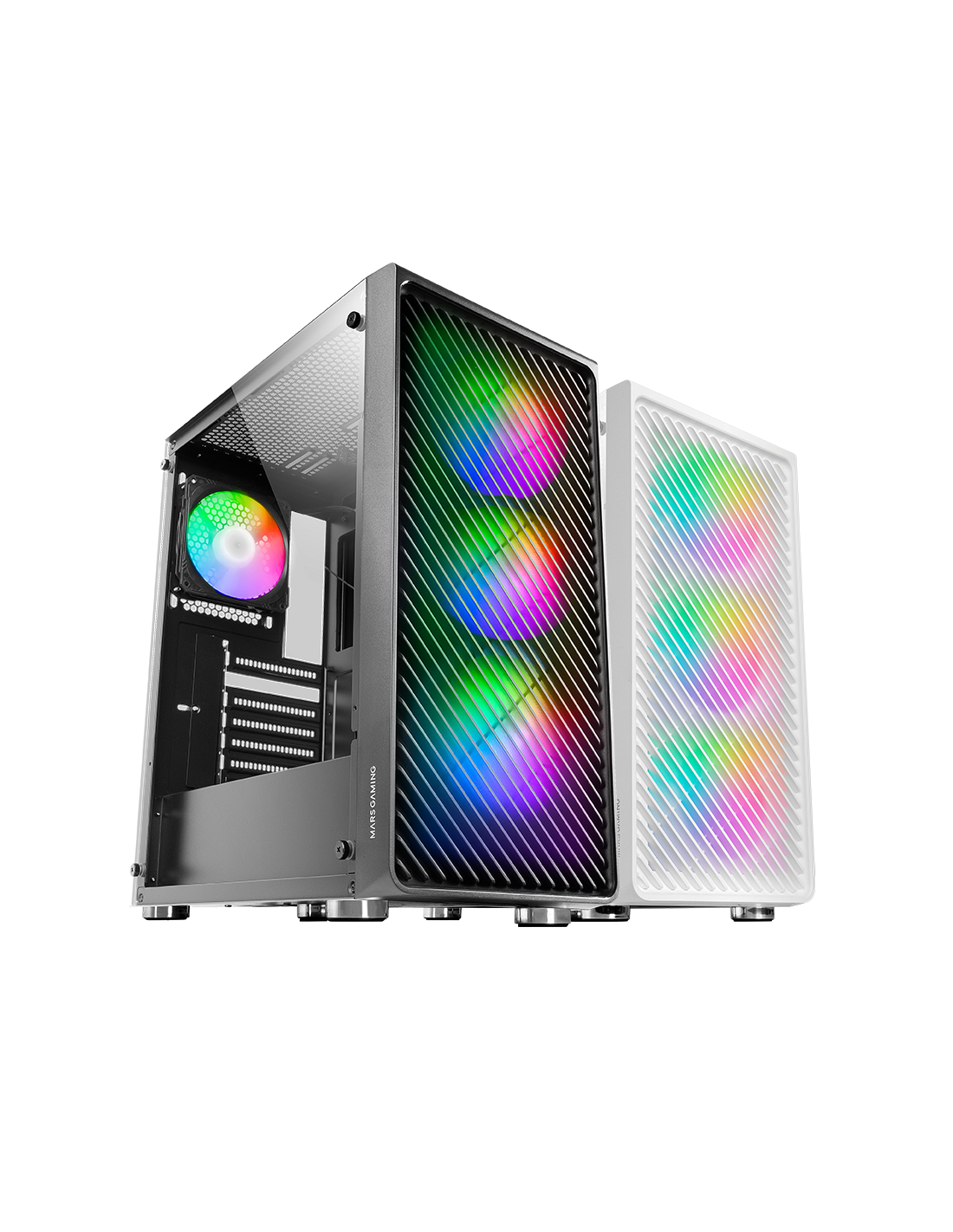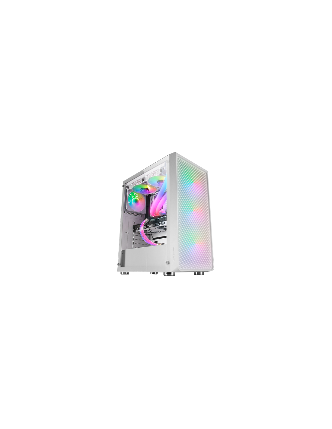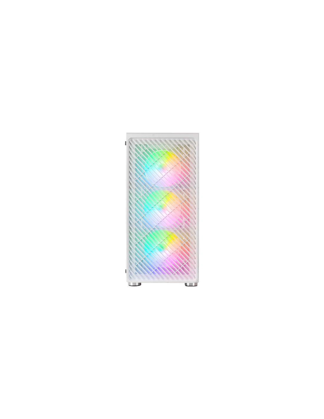 4 ventilateurs ARGB standard pour PC de performance extrême, fenêtre en verre trempé, support complet pour le refroidissement liquide et panneau frontal en METAL-MESH avec un design aérodynamique qui améliore son apparence en combinant refroidissement et éclairage.