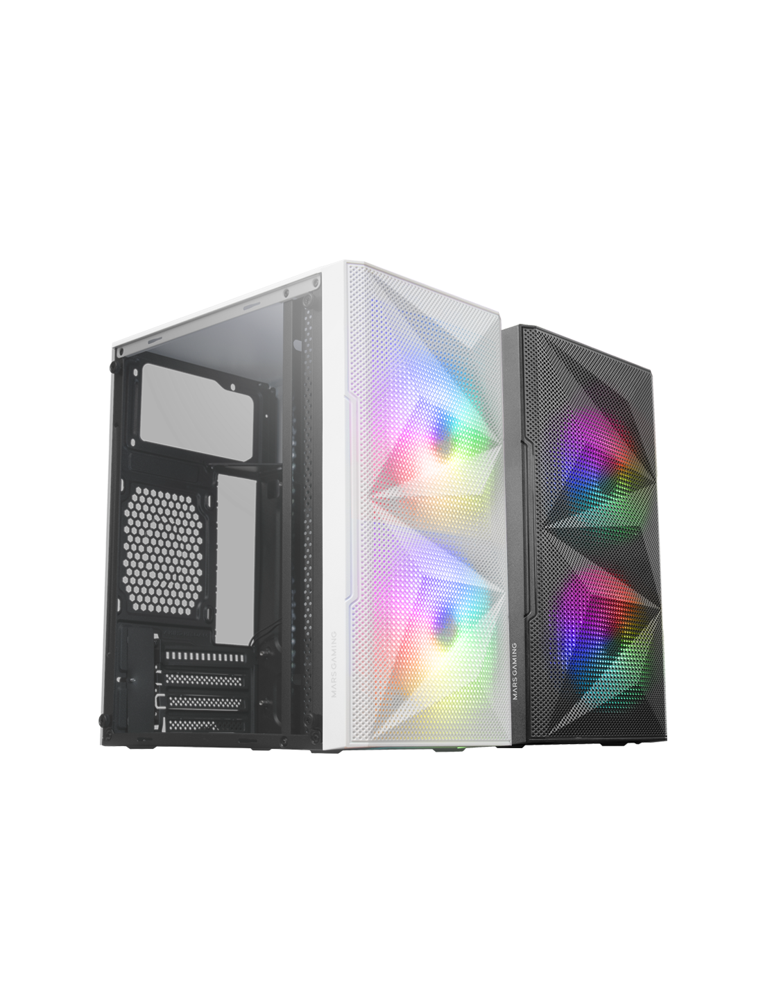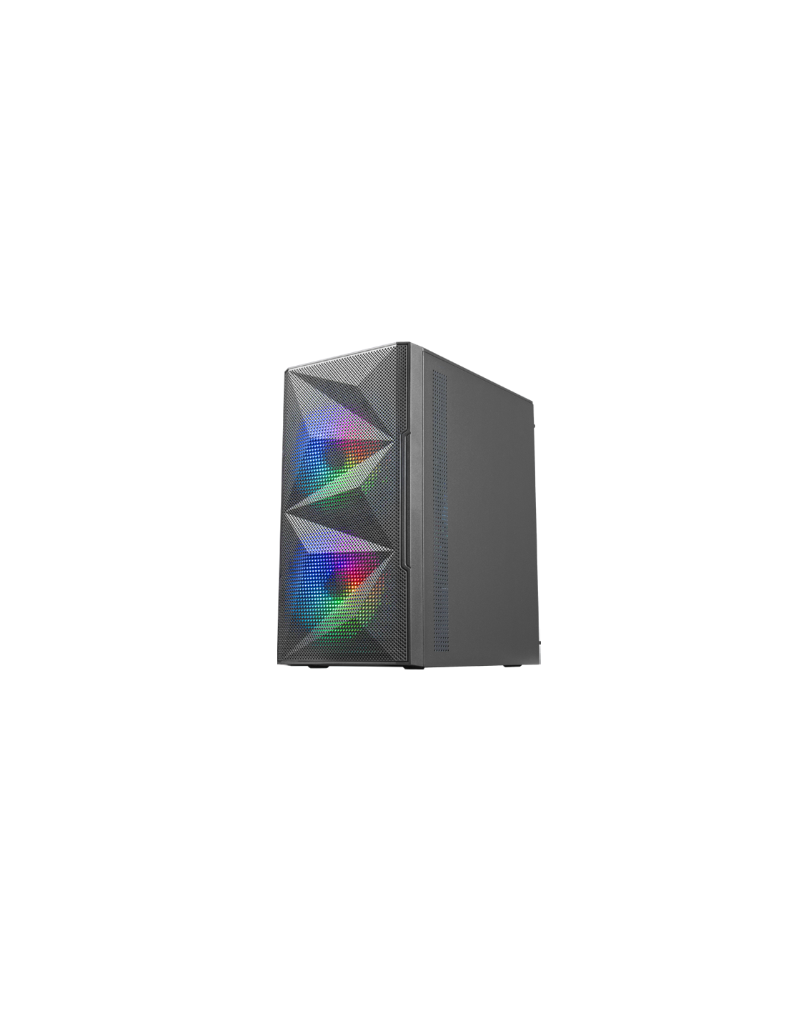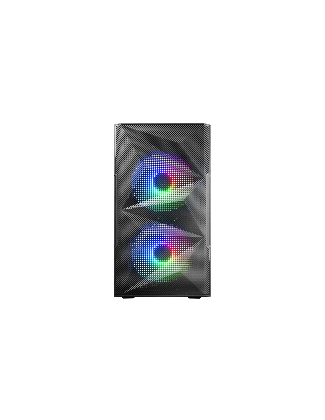 Design innovant avec grille totale-MESH au design géométrique qui renforce l'esthétique et la performance, ainsi qu'une fenêtre latérale totale en verre trempé. Configurations de jeu haute performance au format MicroATX et Mini-ITX. 2 ventilateurs fixes RGB à l'avant et support pour refroidissements liquides.