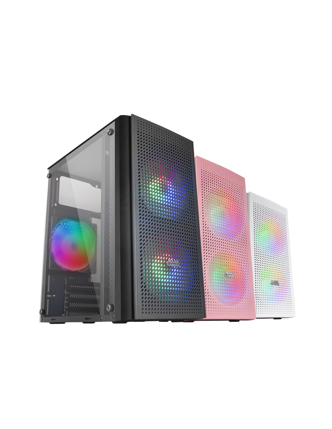 Boîtier compact avec triple ventilation intégrée pour des configurations de jeu haute performance en format Micro-ATX et Mini-ITX. Fenêtre latérale en verre trempé. Disponible dans les classiques noir, blanc et en exotique PINK.