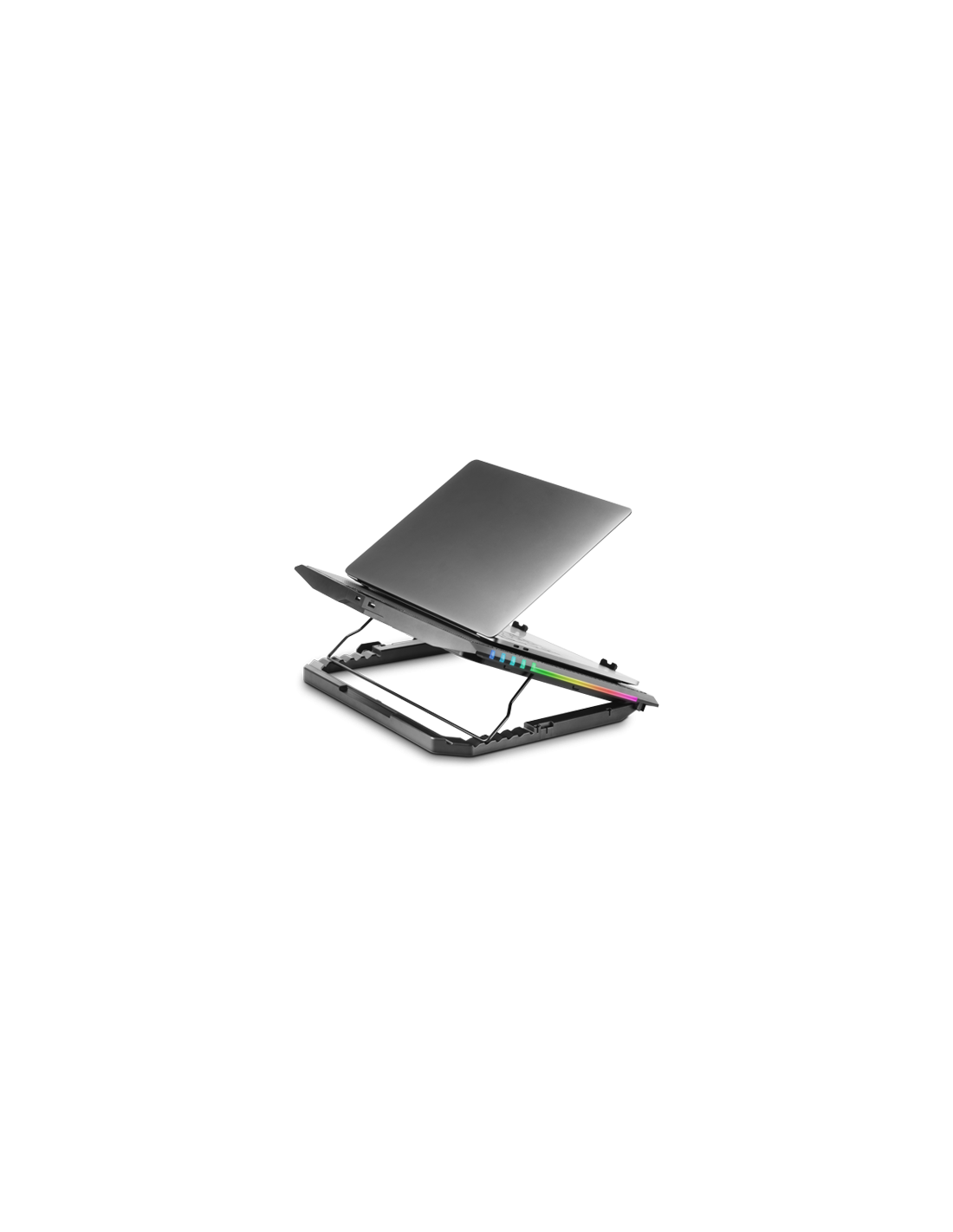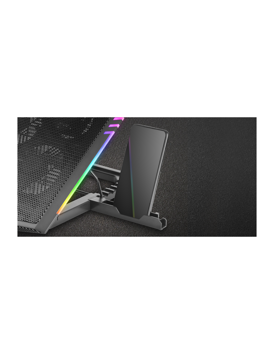 La base e il supporto di raffreddamento per laptop più avanzati. Tutto ciò che potresti desiderare a portata di mano: spettacolare illuminazione ARGB dinamica controllabile, grande dimensione XL per supportare i laptop più potenti, raffreddamento estremo con 6 ventole controllate digitalmente, funzione supporto con 7 posizioni selezionabili e un esclusivo supporto per il tuo smartphone.