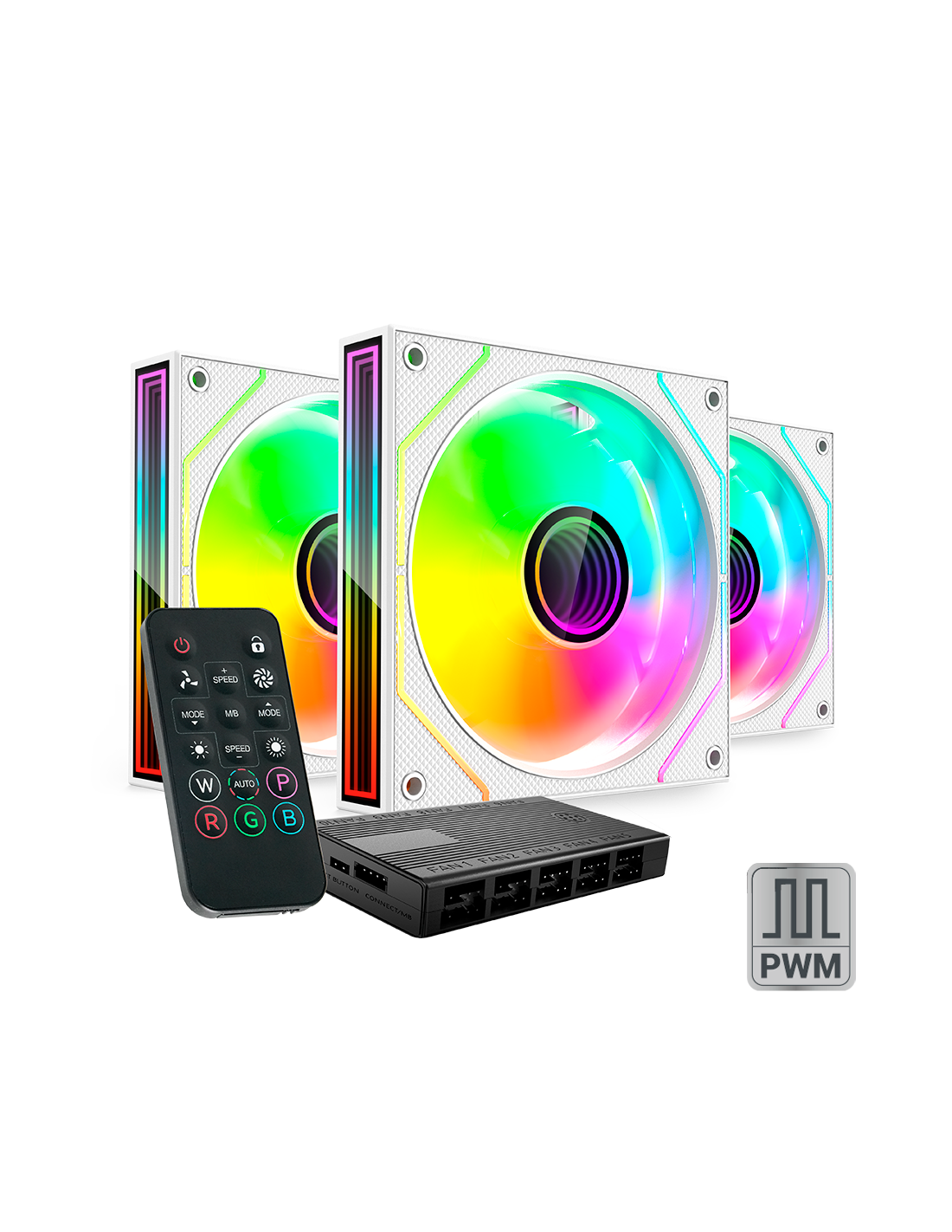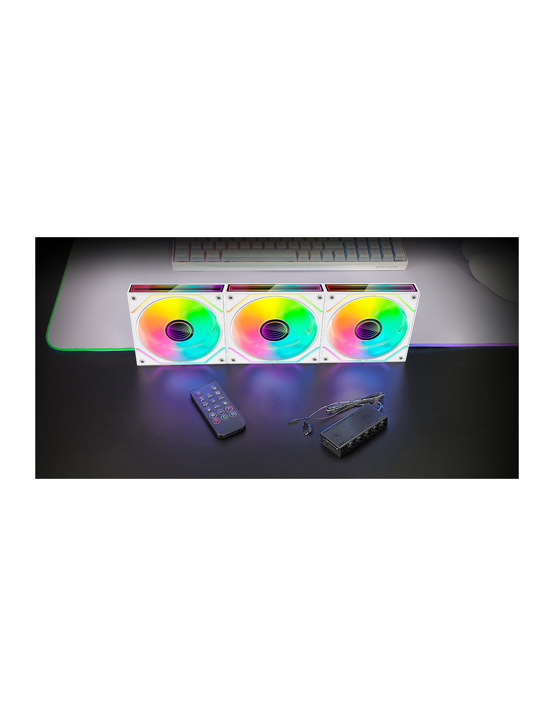 O kit de ventiladores MF-3DPROKIT combina design, desempenho e personalização avançada com iluminação Infinity Mirror 3D com efeitos 360º e uma moldura ARGB dinâmica. Equipado com ventiladores de 120mm com rolamentos FDB, garante um funcionamento silencioso e duradouro. Seu HUB ARGB para até 10 ventiladores e seu controle remoto permitem ajustar a velocidade e a iluminação em tempo real. Compatível com ASUS AURA Sync, Mystic Light Sync e RGB Fusion, integra-se perfeitamente em qualquer setup gaming.