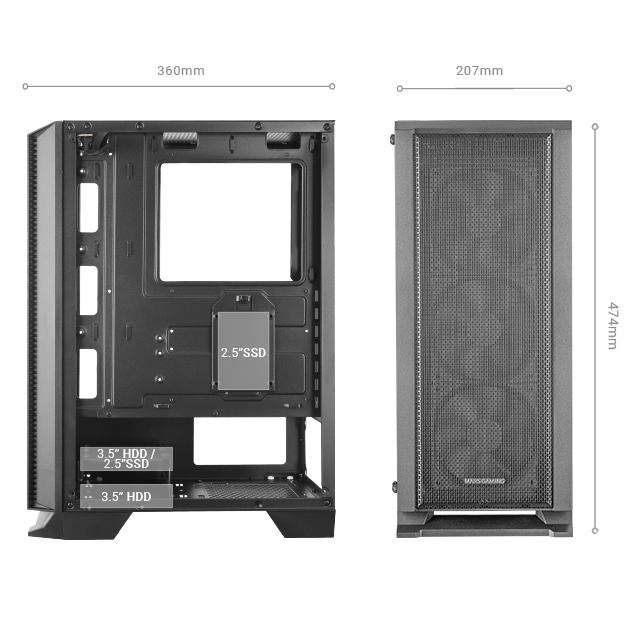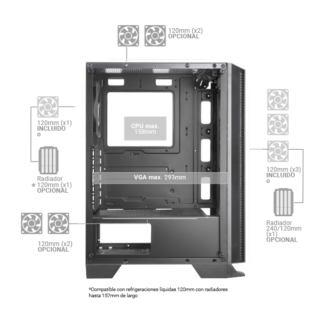 - 120mm frontal / *120mm traseiro (compatível com arrefecimentos líquidos 120mm com radiadores até 157mm de comprimento)