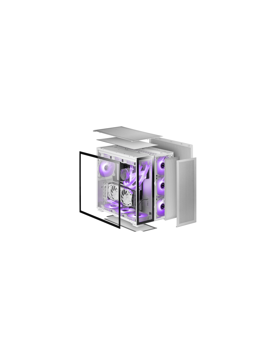 Nossa caixa gaming topo de gama, fabricada em alumínio aeroespacial de 2mm de espessura, duplo vidro temperado, sistema de refrigeração da placa base em ambos os lados, grandes painéis removíveis de ventilação, filtros de pó ocultos, suporte para até 12 ventoinhas, suporte completo de refrigerações líquidas, estrutura de dupla câmara e tamanho XXL E-ATX para construir os sistemas gaming mais extremos que você possa imaginar.